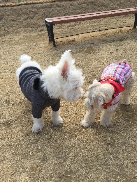그 때만 해도 강아지들은 그냥 냄새 맡고 ‘안녕!'하고 친구가 되는 줄 알았던, 개를 알지 못 했던 사람이었기 때문에 아무 제재 없이 마루를 그런 상황에 돌봄 없이 놔둔 것입니다. 지금이라면 산책을 하다 견주분과 인사도 나누고 견주분들의 주의 아래 안전하게 냄새를 맡게 할 것입니다. 만약 주변에 강아지 운동장과 같은 실외 공간이 있다면 그 곳엘 가거나 말이죠. 한꺼번에 많은 사람, 많은 강아지와 인사시키기보다 천천히 시간을 두고 친해지는 연습이 중요했던 것 같습니다. 마루에게 친구가 생긴 과정을 돌이켜보면 말이죠.