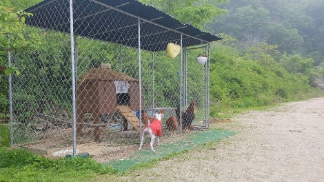 숙소로 돌아와 간단히 요기를 하고 다시 산책을 나섰다. 새벽의 산책이 각인되어 절로 발이 움직였다. 해가 조금 높아진 때문인지 닭들이 나와 다니고 있었다. 태어나 처음 닭과 마주한 마루는 뒤에 내가 있어서였는지 정말 용감하게 다가갔다. 물론 수탉이 쪼을듯 다가오자 냅다 줄행랑을 놨지만 6개월 무렵의 마루에겐 최대의 용기였을 것이다. 이 정도면 다른 지역에서의 첫 숙박으로 몹시 만족스러웠다. 강아지와 함께 하는 자연은 어느 곳에서나 새로운 속살을 풀어 보여주고 있었다. 맑은 아침 공기를 깊이 들이마시며 아쉬운 마음으로 다음 장소를 향해 차를 몰았다.