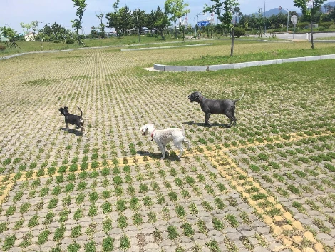 마침내 출발 시간이 됐다. 새벽에 일어나 짐을 옮기고 차에 타기전 마루와 가벼운 산책을 하며 흥분을 조금 가라앉혔다. 아무래도 장시간 차를 타고 이동해야 될텐데 배변을 참는 것도 걱정 됐다. 출발전 15분 가량 주변을 한 바퀴 돌고 마루를 차에 태웠다. 산책전 평소와 다른 보호자의 태도에 흥분했던 마루도 산책 후 한결 차분해진 표정으로 차에 타 카시트에 몸을 기대고 곧 잠이 들었다. 그래도 한 시간 정도 지나면 꼬박 휴게소에 들렀다. 처음 휴게소에 차를 세울 땐 내심 걱정이 됐었다. 늘 다니던 휴게소에 마루가 냄새 맡을 풀이나 흙, 나무 등이 있을까? 하는 염려에서였다. 그러나 마루의 리드줄을 잡고 휴게소 주변을 둘러보며 뜻밖의 장소들과 마주했다. 산책로가 정말 잘 만들어져 있었다. 어떤 휴게소들은 지역의 명소들을 재현해 놓기도 했지만 대부분 운동 기구와 함께 산책로가 조성되어 있었다. 강아지 전용 운동장이나 쉼터가 있는 곳도 있었다.
