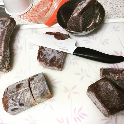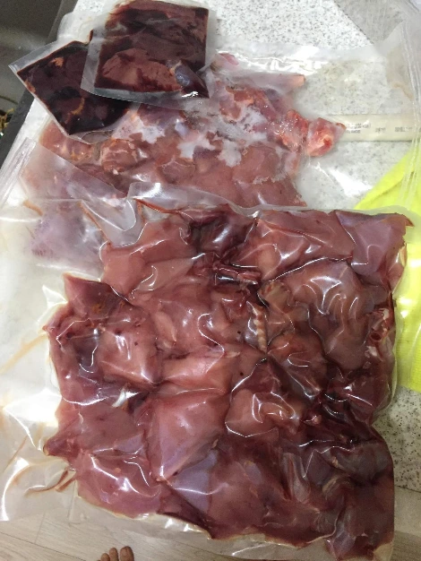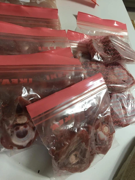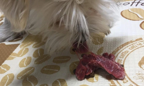 그래서 개껌 대신 오리 도가니 뼈를 주문했고 (식사용으로는 고기가 덩어리로 붙은 오리 다리가 좋다.) 처음 고기를 줬을 땐 잘 먹지 않아 사료와 함께 섞어 주었다. 그런데 도무지 내장을 구할 수가 없었다. 신선한 내장을 구하는 건 정말 발품을 팔아 노력하지 않으면 힘든 일이었다. 구해도 문제였다. 내장은 보통 큰 덩어리로 파는데 마루 혼자 먹으려면 대부분을 결국 버려야 했기 때문에 마루에게 생식을 하겠다는 계획은 1년도 지나지 않아 큰 암초에 부딪혔다.