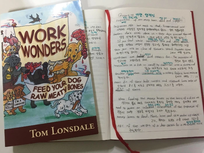 톰 론스데일의 방법은 자연 상태의 육식 동물들이 영양분을 섭취하는 그대로의 생식을 제안하고 있어요. 이 방법은 내장을 구하기 힘들고 풀을 먹인 소나 양이 드문 한국에서 힘든 생식 법이라고 생각합니다. 결국 먹거리에 관심을 가졌던 것도 마루가 좀 더 건강하게 오래 함께하길 바라는 마음에서였고 여건이 된다면 내가 맛있는 음식에서 행복을 느끼듯 마루도 좋아하는 음식을 먹으며 행복하길 바라는 마음이었어요. 요즘은 영양학에 관한 상담을 할 수 있고 그에 따라 생식 레시피를 받아올 수도 있습니다. 불과 1년 전까지만 해도(2018 초 무렵) 생식에 대한 정보는 무척 제한적이었지만 2019년 현재 영양학 연구소라는 곳에서 상담도 할 수 있고 레시피를 받아 볼 수도 있으며 여러 카페에 가입하여 다양한 정보를 얻을 수도 있습니다. 워낙 방법이 다양하고 정답이 없는 부분이라 딱 꼬집어 말할 수는 없으니 반려견과 함께한다는 건 끊임없는 공부를 동반한다고 할 수 있겠습니다.