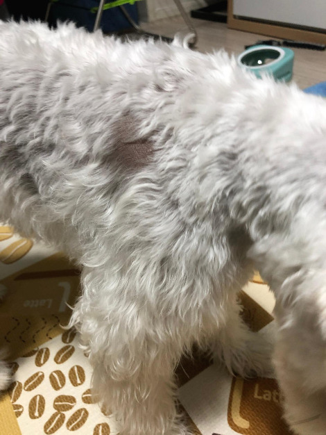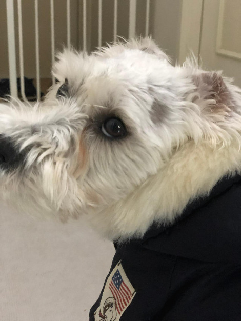 어쩌지? 하는 순간 이상한 낌새를 느낀 마루가 머리를 휙 돌렸고 그 틈에 클리퍼가 마루의 눈 위를 깨끗하게 밀어버렸다. 그래서 한동안 마루는 머리와 몸통에 '땜빵'이 난 상태로 다녀야 했다. 몸통의 '땜빵'은 옷으로 가리면 되는데 머리는 가릴 수 없어 털이 길 때까지 기다려야 했다. 겨울이어서 정말 다행이었다.