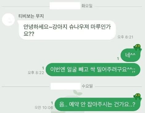그러나 슈나우저 마루인지 물어보는 연락 이후 연락이 없어 다른 곳을 찾아 예약을 잡아야 했다. 하려던 곳에서 예약이 잡히지 않아 다른 곳에 예약을 하면서 마루가 미용하기 힘든 아이였나, 다른 곳에서도 이렇게 거절을 당하면 어쩌지, 등의 생각이 들끓어 몹시 심란했다. 주변에 강아지 미용을 하는 곳은 많은데 받아주는 곳이 없으면 무슨 소용이지? 하는 생각에 처음으로 클리퍼를 검색하기 시작했다. 그리고 검색을 하면 할수록 마루와 클리퍼를 든 채 울고 있을 '미래의 나'가 떠올라 조용히 노트북을 덮었다.