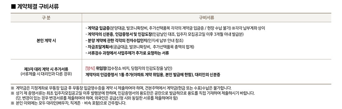 이체확인증이나 송금확인증을 출력해 가도 되고, 입금한 내역을 화면캡처해서 입금날짜 및 시간을 알려줘도 된다. 미리 안내해 준 3개의 계좌로 각각 분양 대금 계약금 20%, 발코니 확장비 10%, 옵션 계약금 10%를 각각 정해진 계좌에 입금해야 한다. 입금할 때 입금자명에 동호수 계약자명을 꼭 기재해야 한다.
