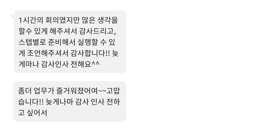 사팀장님에게 메시지가 왔다. 첫 미팅을 한지 두 달이 조금 넘었다. 예상 못한 메시지였지만 꽤나 반가운 소식이었다. 새로운 프로젝트 준비로 미팅이 줄지어 있었고, 하루의 반도 채 지나지 않았지만 벌써 네 번째 미팅을 하고 있던 메시지를 보고 혼잣말을 했다.
