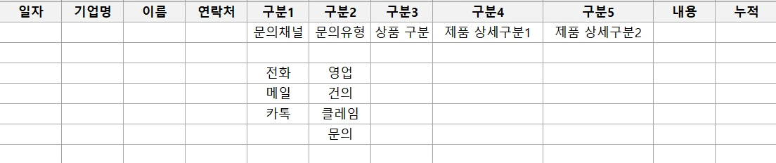 상담 시트의 '구분' 이 정말 중요한데, 처음부터 완벽하게 담으려 하기보다 기본 구성을 담고 매주, 매월 팀 미팅을 통해 세부 항목을 추가해 나가면 된다. 단, 통계 데이터가 크게 달라지지 않도록 기존 항목은 유지하고 새롭게 추가해 가는 것이 좋다. 큰 변화는 가급적 상하반기 또는 연단 위로 변경을 권장한다.
