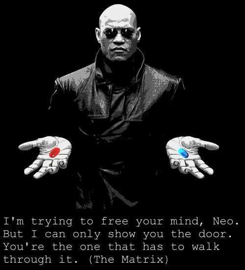 빨강 먹으면 개박살나고 파랑 먹으면 지금까지의 행복한 삶이 죽 이어진다. 어떤거 먹을텨? 진실에 대한 도전이냐 매트릭스 안의 안정된 행복이냐의 선택.