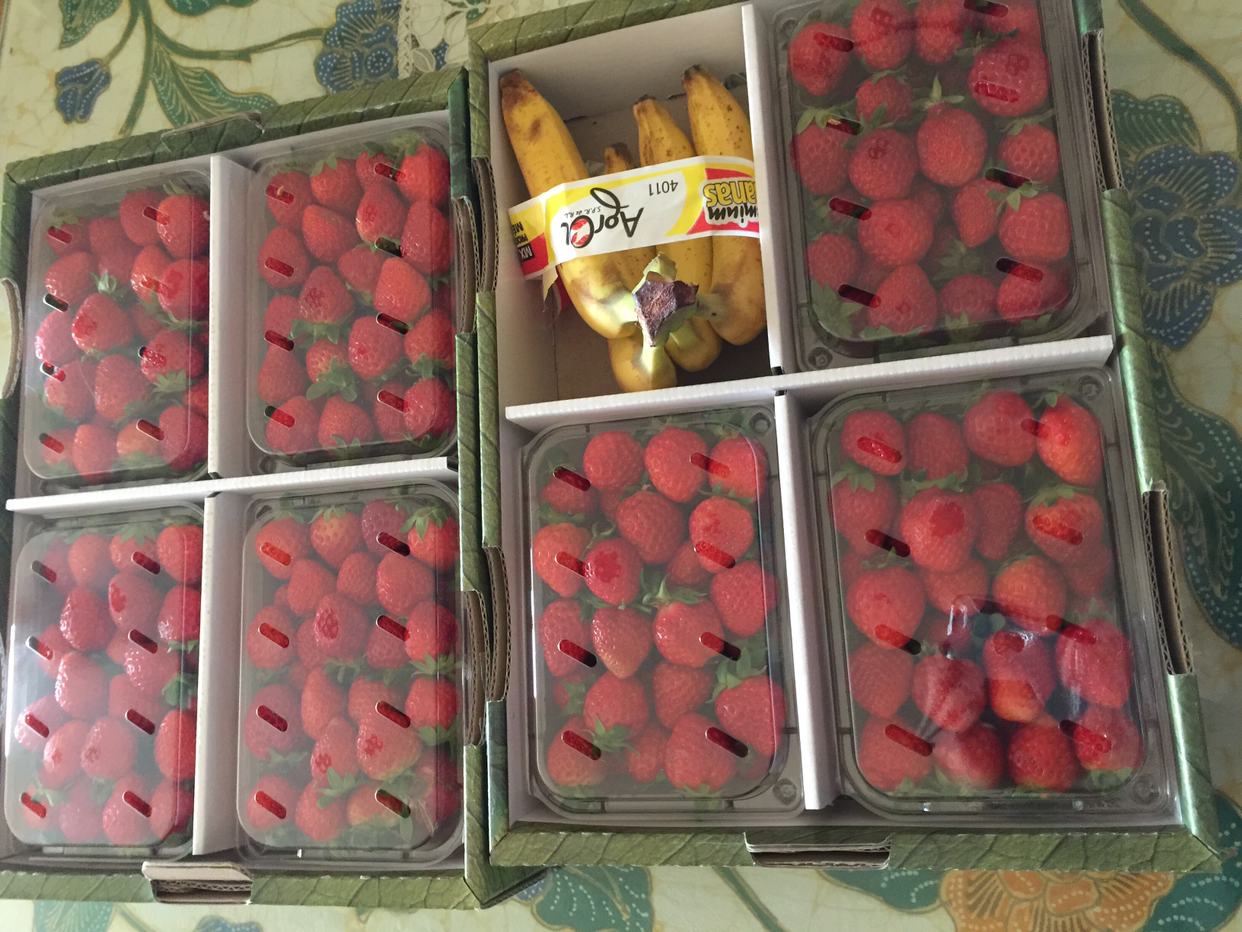 차를 찾아 나오면서 과일트럭을 발견, 딸기가 4팩에 8천원!!! 바나나 6개에 2천원 ,대박이다 싶어 딸기 두박스를 샀다. 싼 채소 과일 가격은 지방 장터에서 만이 누릴수 있는 혜택이다. 요즘 과일을 많이 먹으려 하고 있는데 유난히 딸기만은 비싸서 선뜻 주문을 못하던중 이었는데 마침 눈에 딱 띄어 딸기파티를 벌일수 있게 됐다. 부라보!