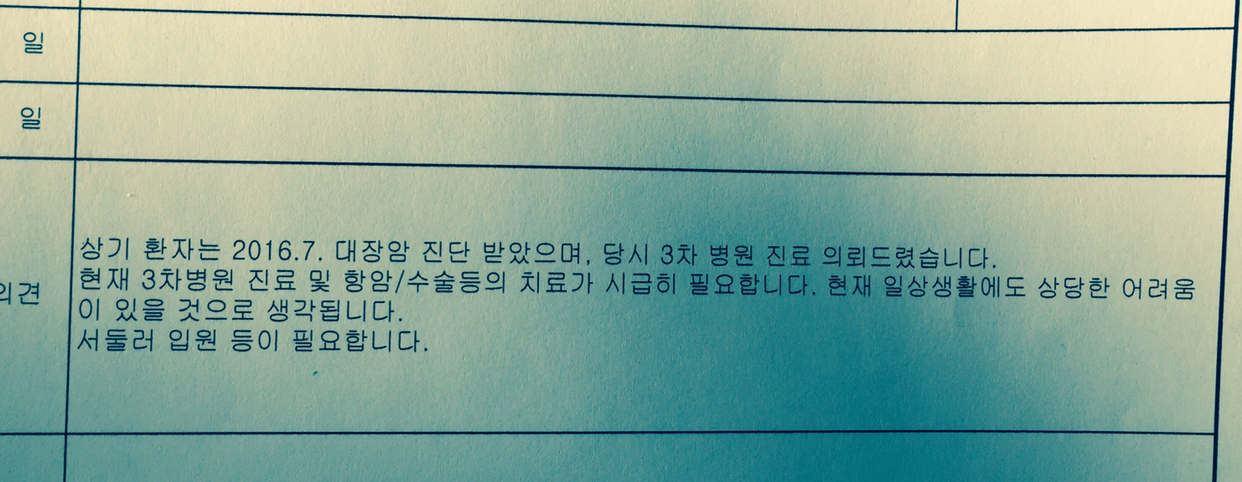 어쨋든, 산정특례 대상자와 암환자 등록, 진단서등은 작년에 진단받았지만 별다른 어려움 없이 처리되었다. 산정 특례 대상자라고 해서 병원에 입원하거나 항암제를 투입할 맘은 절대 없다. 단지 , 이것저것 혜택을 알아보기 위해 서류상 암환자라는 증명서가 지금의 나에겐 필요할뿐이다.