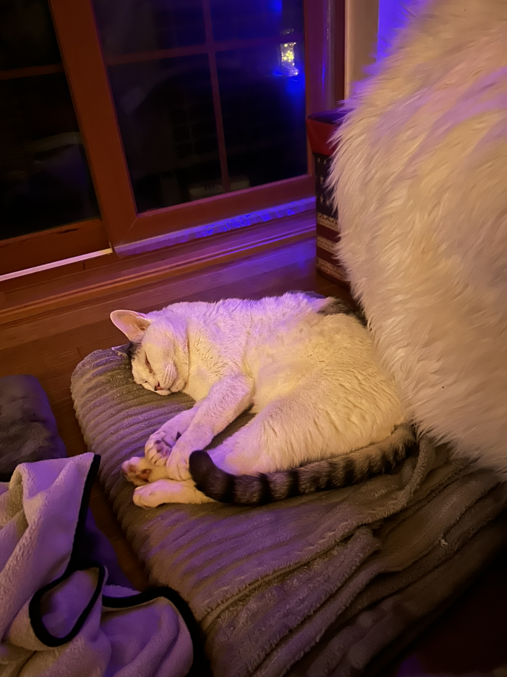 바깥에는 사람들 기척만 나도 도망가는 녀석들에게 일년간 먹이를 내주고 있는데 한겨울 집밖과 집안 길양이 처지가 천국과 지옥 극명하게 갈린다. 식빵모드로 있는 고양이는 쉬거나 자는듯해도 항상 스탠바이 긴장 상태다. 같은 고양이도 길양이는 항상 긴장 상태로 생활하는지라 평균수명 2-3년이고 집안에서 잘 보살피고 하루 20시간 가까이 숙면을 취하게 놔두면 15년 까지도 산다고 한다. (녀석은 9살이라 길양이 수명 몇배이상을 산 셈이다.)