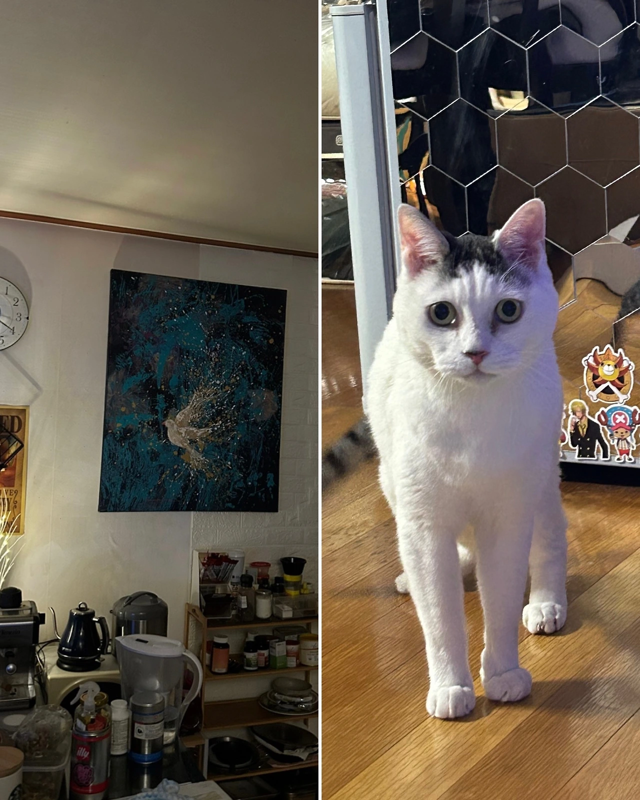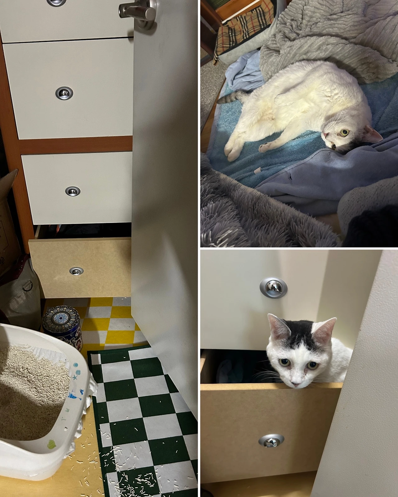 *살짝열린 옷장서랍 속에 액체처럼(?)흘러 들어가 빈틈없이 개어있는 옷인양 위장하고 있다. (5cm 정도 열린 옷장 서랍안에 숨어 있으리라 누가 생각하겠는가) 시트지를 뜯어내 옷장문을 스스로 여는 기술을 익혀서 옷서랍 마지막 칸은 아예 시트지 제거하고 녀석의 은신처로 내줬다.