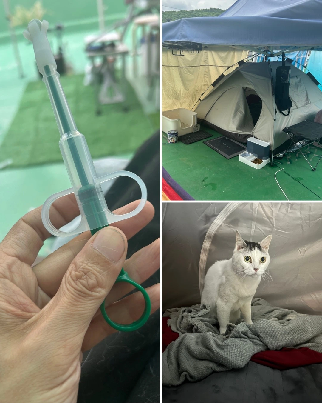 강하게 뒷목을 콱 움켜쥐고 녀석이 이거뭐야? 당황할때 입에다 기구로 쏙 끝이다. 나처럼 설득하고 달랜답시고 계속 깐작깐작 비위만 거슬리는 어설픈 시도보다 강한 임팩트 한방과 타이밍이다. 녀석이 어리둥절해서 야옹 소리도 못낸다.