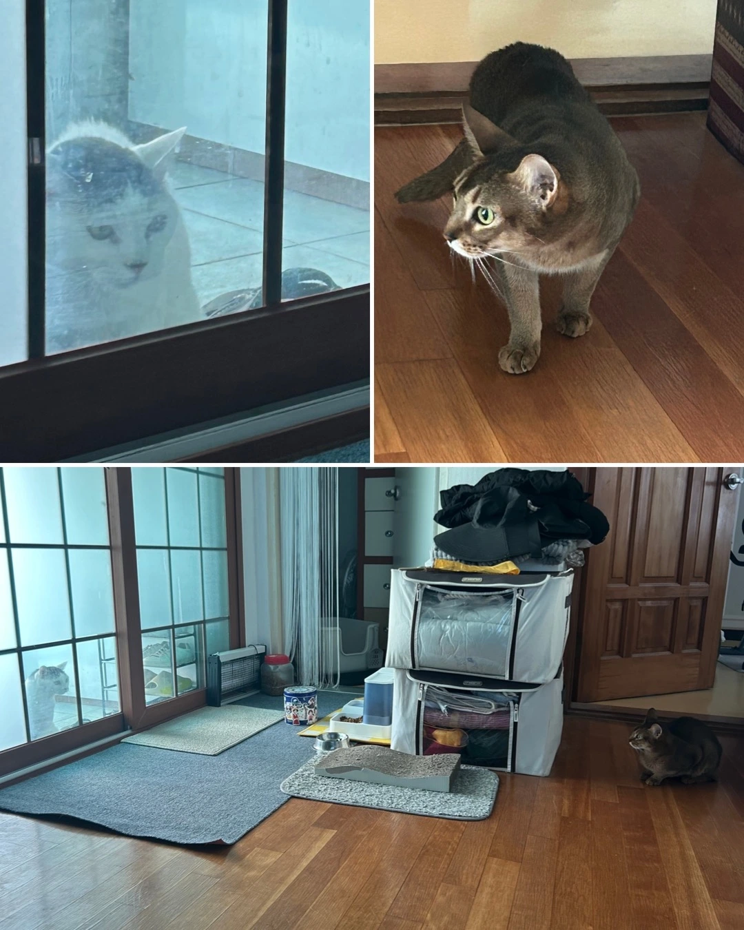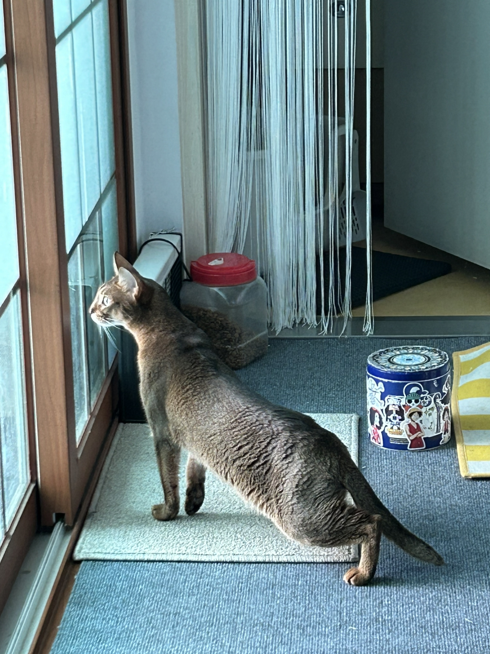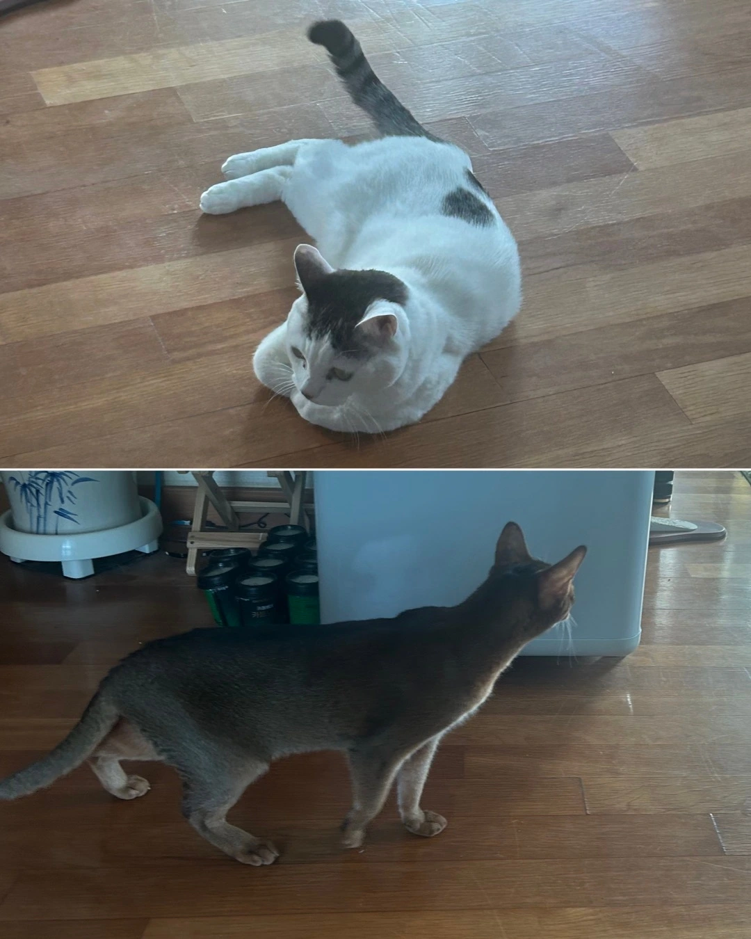 녀석은 없는듯 빼꼼 눈치만 보고 거실 영역을 새로온 애가 하루만에 장악해 버린다. 화장실도 자기것은 작아서 맘에 안드는듯 녀석의 화장실을 자기것처럼 쓴다. 이것이 그 gr 맞다는 아비시니안의 빠원가? 길양이들 사회처럼 힘으로 서열 세우는 것보단 낫다. 둘다 싸울 기미는 없어 보이고 암컷이 하나 끼니 구도에 안정감은 생긴다. 팬스만 보던 녀석의 버릇이 싹 없어졌다. 시간마다 연속 드라마를 찍는 두 녀석 밀당이 사람들 연애 드라마 보다 재미있네 하.