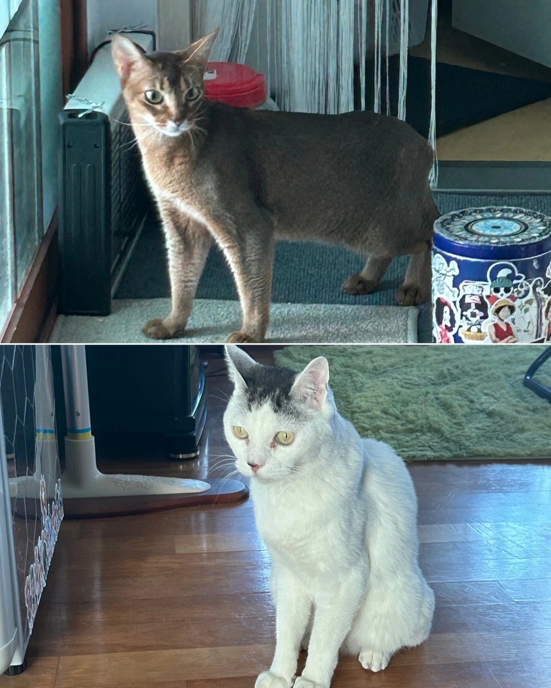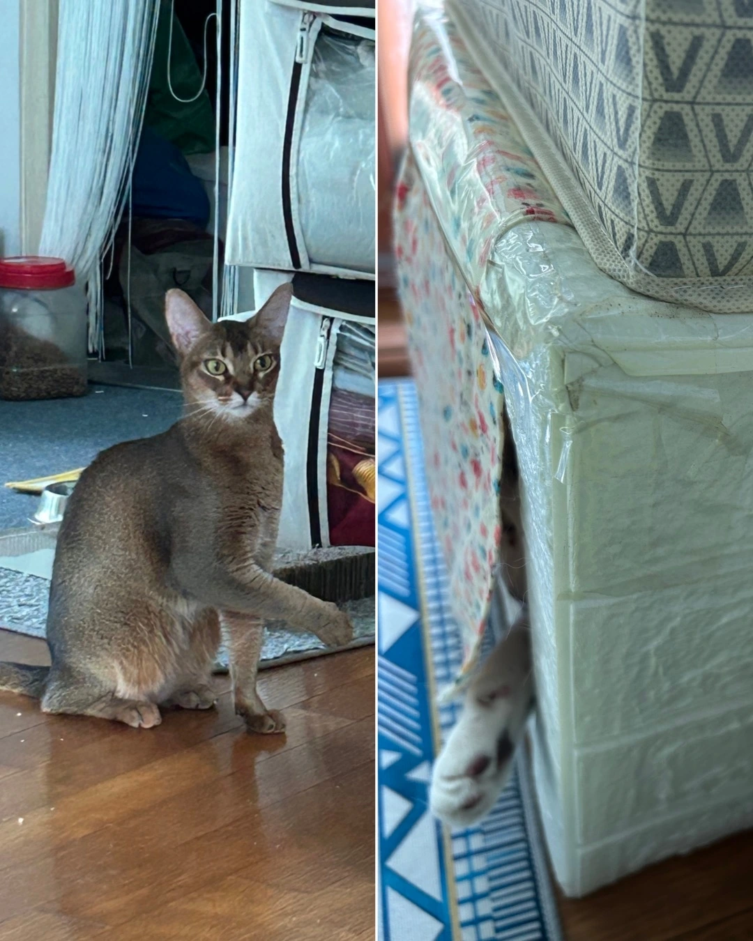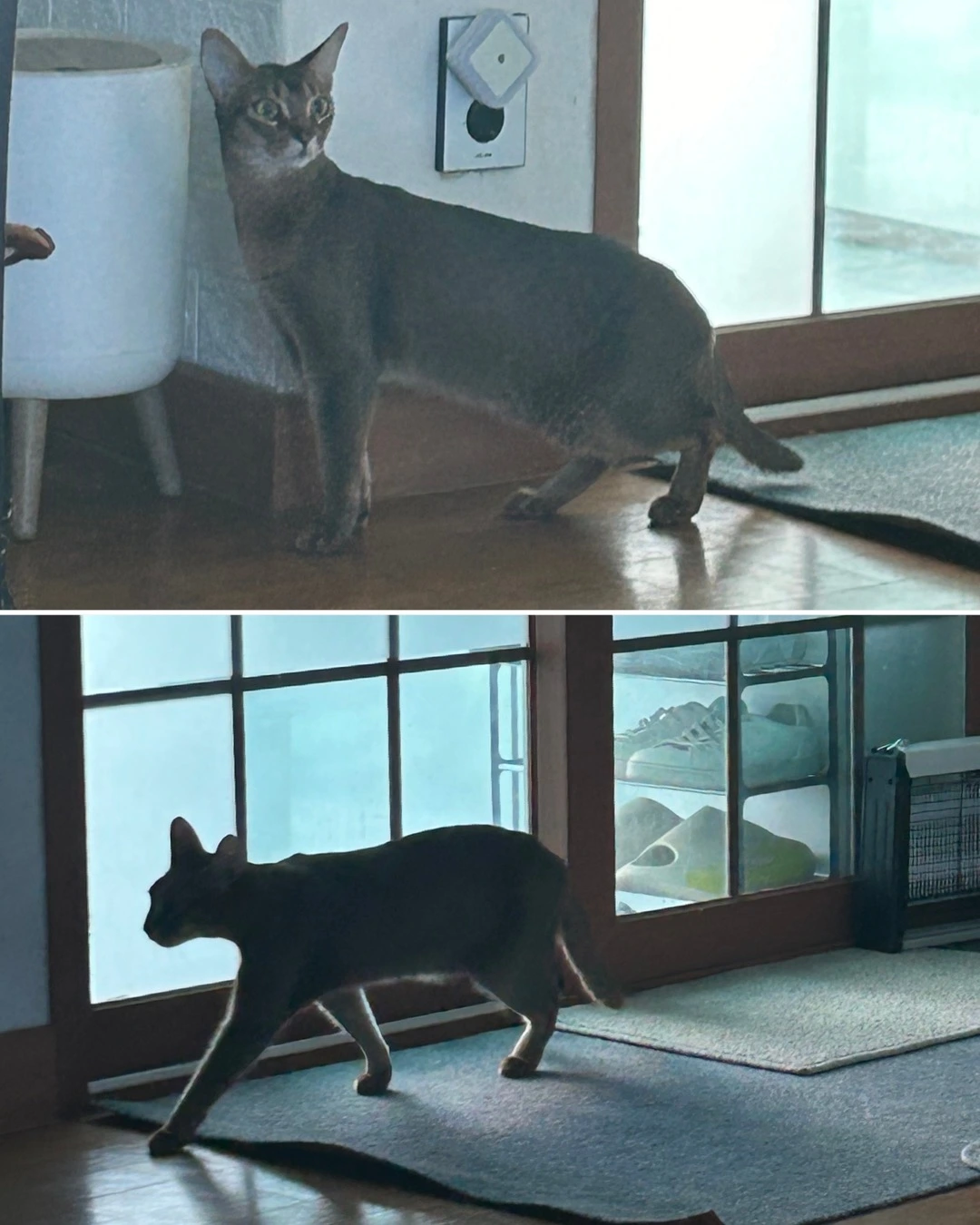 녀석은 없는듯 빼꼼 눈치만 보고 거실 영역을 새로온 애가 하루만에 장악해 버린다. 화장실도 자기것은 작아서 맘에 안드는듯 녀석의 화장실을 자기것처럼 쓴다. 이것이 그 gr 맞다는 아비시니안의 빠원가? 길양이들 사회처럼 힘으로 서열 세우는 것보단 낫다. 둘다 싸울 기미는 없어 보이고 암컷이 하나 끼니 구도에 안정감은 생긴다. 팬스만 보던 녀석의 버릇이 싹 없어졌다. 시간마다 연속 드라마를 찍는 두 녀석 밀당이 사람들 연애 드라마 보다 재미있네 하.