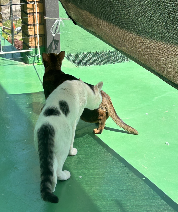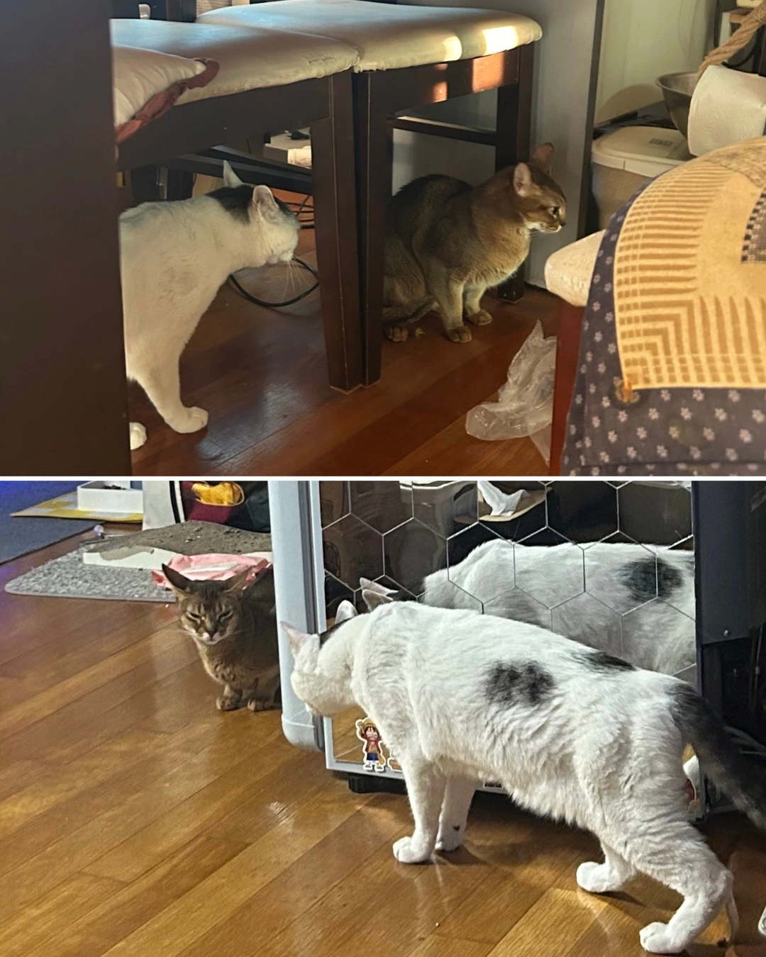 낮선 성묘끼리의 만남은 암수 이전에 영역권 다툼이 우선이다. 합사가 실패하는 이유가 사소한 영역권 분쟁으로 부터 시작된다. 서로 적대감 없는거 같길래 맞대면 시켜주려고 둘다 좋아하는 츄르 다과 자리를 마련해 본다. 결과는..