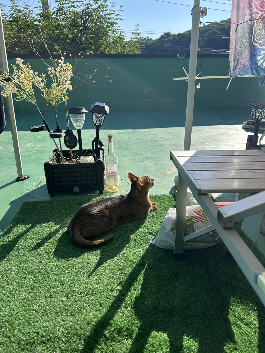 얘들 등쌀에 오늘은 새벽 3시에 기상했다. 탐군은 5시였는데 첼양은 3시다. 3시에 침대로 뛰어들어 열심히 꾹꾹이 안마를 해대고 탐군은 밤새 문앞에 대기중이고.. 이것들 여름되니 둘다 노는데 정신이 팔려 잠잘 생각들을 안한다. 얘들 땜에 새벽부터 부지런히 마당 청소다. 흙바닥은 아니라지만 혹시 몰라서 진드기 방지제 곳곳에 뿌리고 쓸고닦고 빨아들이고 얘들 햇살 즐기는 댓가를 내가 치뤄야 한다. 둘다 운동량이 많아지니 잘먹고 잘싸긴 한다.
