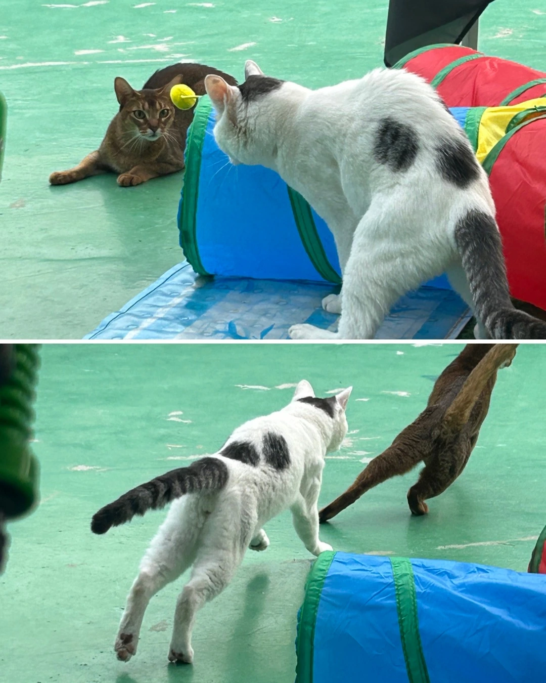평화롭긴 한데 매우 단조로운 나잡아봐라 놀이의 연속이다. 모르는 사람이 보면 둘 사이가 안좋아 싸워대는줄 알거다. 사실은 첼양의 하악질이 경계라기 보다는 “아이 귀찮아 다가오지마” 정도고 계속 까이면서도 탐군이 잘 질척댄다. 그러다 무심한듯 풀죽어 있으면 첼냥이 또 먼저 다가가 나 잡아봐라 그러고 도망치는 친해지기 위한 정석 과정이다.