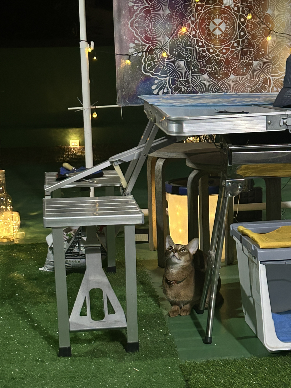 첼양은 분리가 필요해 일단 내 침실에 거처를 마련해 줬는데 잠도 안자고 새벽 3시면 침대로 뛰어들어 꾹꾹이 안마를 한다. (탐군보다 몸무게 차이로 시원한 강도는 절반 수준이다.) 발전기가 가동해 엔진이 시동을 걸고 온 몸을 떨기 시작하는데 만져보면 작은 체구에도 출력이 굉장하다. (자동차 배기량 맞먹는 오토바이 엔진같다.) 고양이들의 꾹꾹이는 ‘이건 내꺼’ 라는 표식을 남기는것으로 발바닥에서 자신의 체취 액체가 나온다. 작아도 이불이 축축한것이 생명력이 왕성하다는 표식이다.