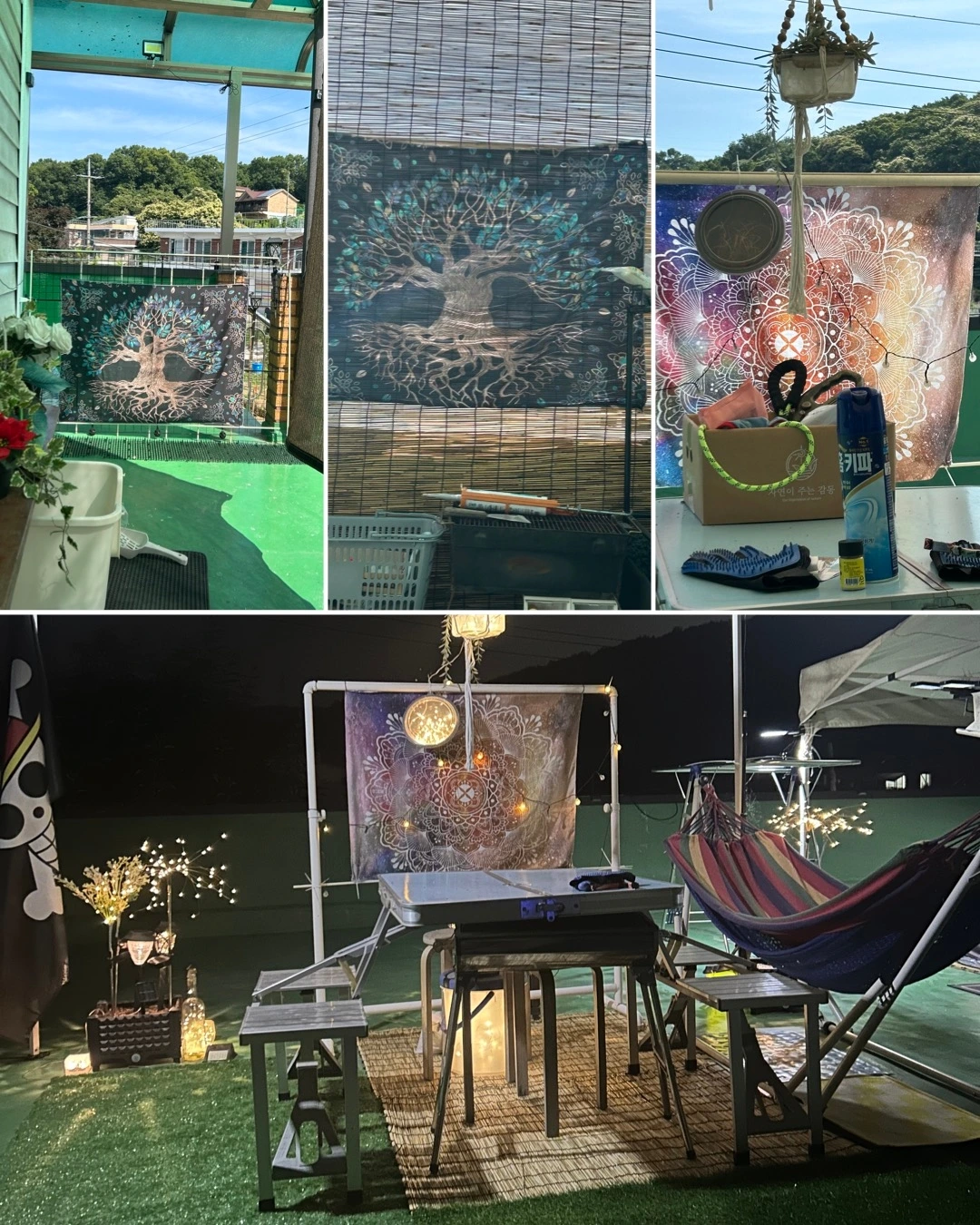 낮에는 수시로 마당에 물 뿌려주고 탈수 방지 물을 항시 준비해 둔다. 문을 열어두고 모기장 커튼을 문마다 달아놔야 녀석들이 맘대로 실내외를 들락거릴수 있다. 한 집에 식구가 는다는것이 그런것이다. 자꾸 짐이 늘어만 간다. 아이들 있는집 항상 어수선한거 그럴수 밖에다.
