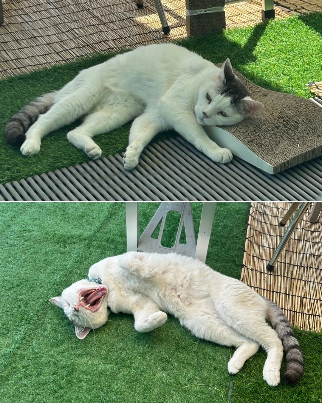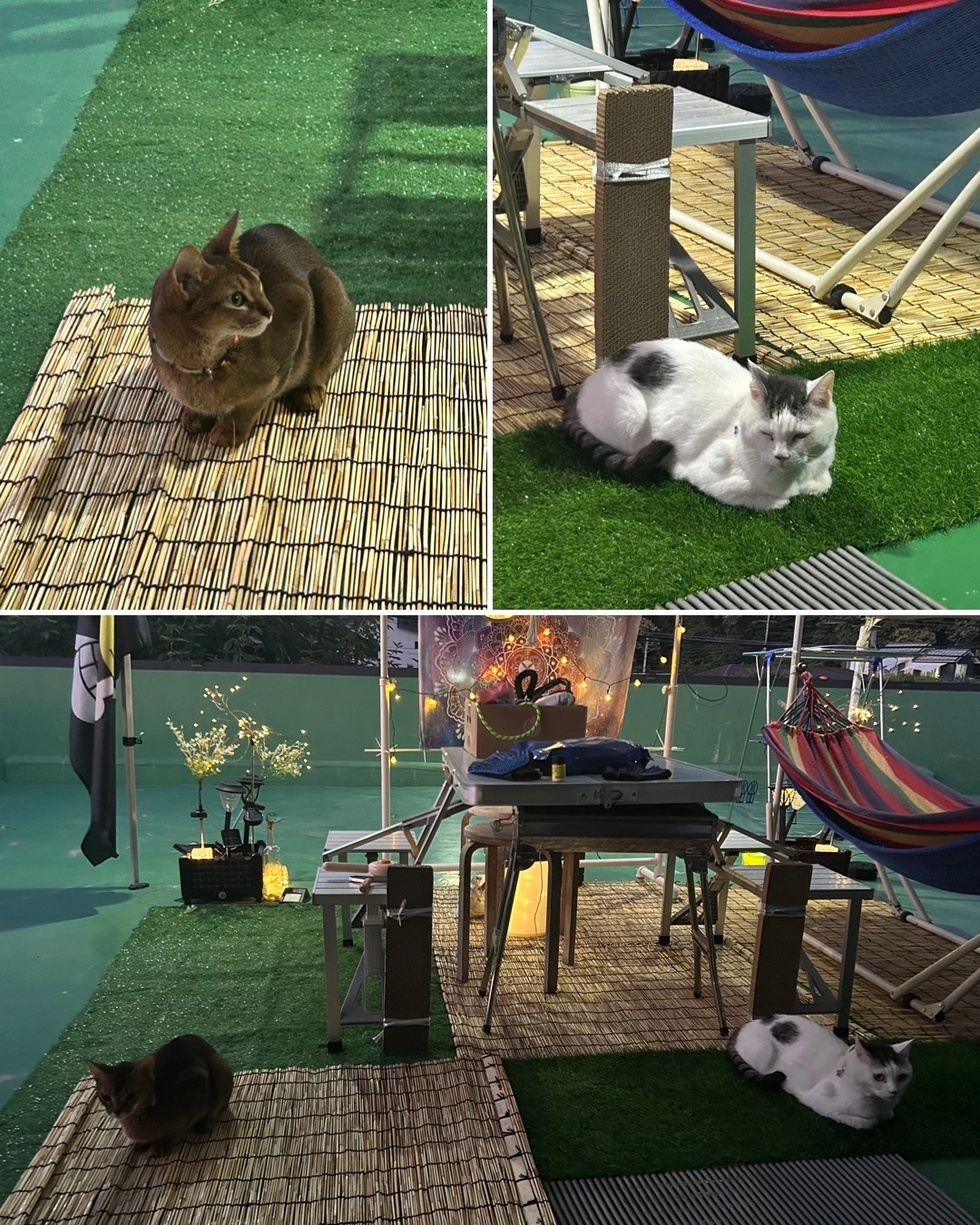 둘이 놀라고 냅두고 난 그저 그냥 평화롭게 커피나 마시고 일광욕 하려던 계획이 얼마나 순진한 발상이었던가. 녀석들이 마당과 거실 내 침실을 돌아 다니는 바람에 먹이대와 화장실을 마당에 한세트, 거실에 한세트 침실에도 한밤중 첼양을 위한 세트 총 3세트를 마련했다. 분리 시킬때를 위함인데 매번 화장실 먹이대 들고 왔다갔다 번거로운 일을 반복하다보니 아예 그렇게 됐다. 둘의 불화 때문에 생기는 불필요한 일들이다.