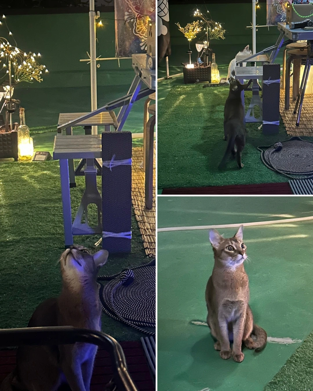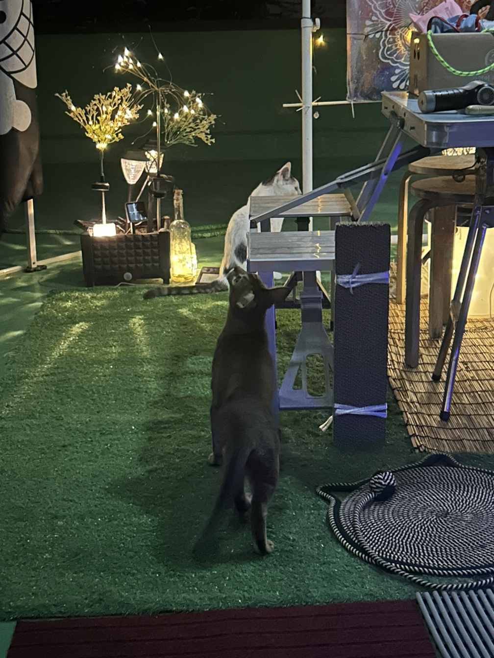 어찌보면 둘의 정 반대 성향이 평화유지에 더 도움이 되고 관계가 오래 갈수 있을지도 모르겠다. 쉽게 달아오를수록 쉽게 식는것이 고양이들 호기심도 그렇다. 탐군이 가만 있으니 첼양이 조금씩 호기심을 보이기 시작한다. (혼자노는 심심함의 한계에 당해낼 재간이 없을것이다.). 고양이가 호감을 느끼는 가장 1순위는 (재력이 아니라) 안정성이다. 위협적이지 않아야 한다. 호기심 많은 고양이 에겐 가만 있는것이 가장 고난이도의 유혹 기술이다. 탐군의 순둥이 성격에 딱 맞는다. 계속 스토킹 해봤자 까이기만 한다는걸 이제 조금 깨달은거다.