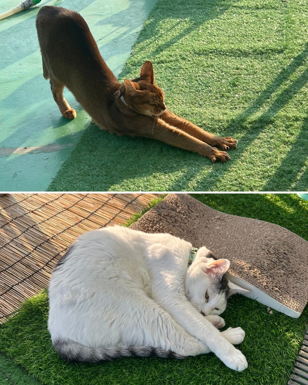 둘의 성격도 정 반대다. 호기심 많은건 둘다 고양이라 당연한데 첼양은 아비종 답게 사교적인데다 정신없이 뛰어 다니는 놀이를 좋아한다. 날아다니는 모든 곤충들을 쫒느라 하루종일 뛰어 다니면서 잠도 안자고 지치지도 않는다. (잠자리와 나비 쫒는걸 가장 흥미로워 한다.) 반면, 탐군도 첨에 와선 그랬지만 지금은 또 세상일에 달관한듯 하루종일 늘어짐을 좋아한다.(나랑 닮았다.). 혼자 커와서 원래 우울증을 기본소지 했던터라 전혀 사교적이지 않다. 취미가 같아 둘이 같이 뛰어 다니면 금방 친해질거 같은데 세대차인가 싶기도 하다.