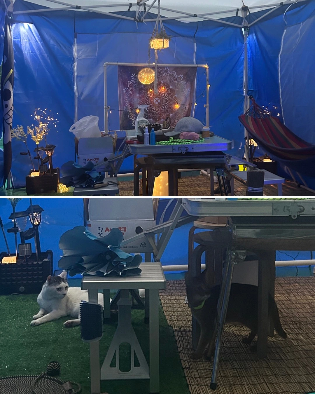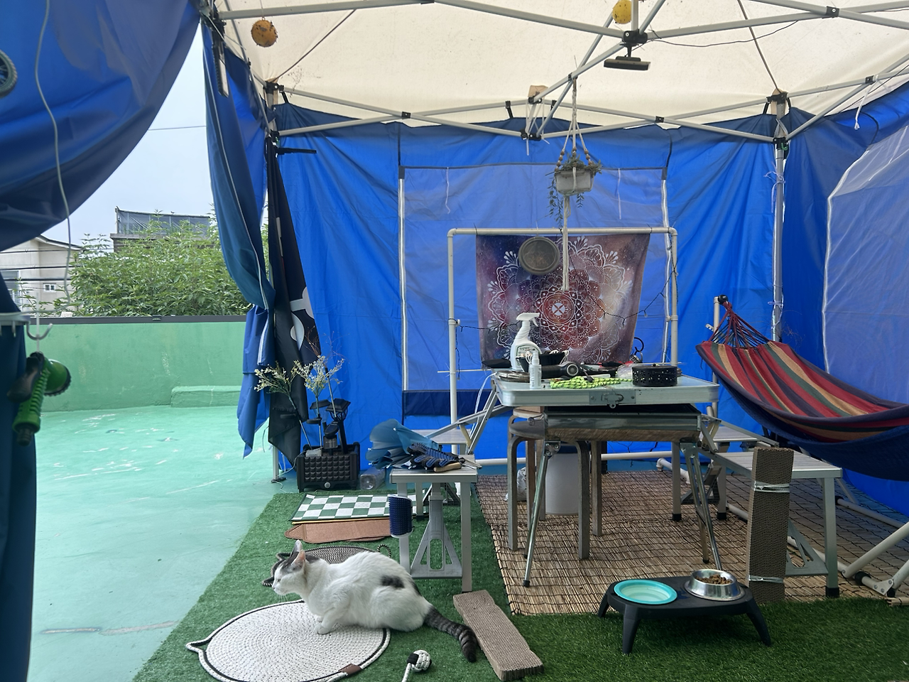 이게 뭔일이냐? 그간 익숙했던 마당 놀이터에 여기저기 천막 벽들이 쳐지니 녀석들 당황해 난리가 났다. 좀만 있어봐라. 소나기 오는거 보고 나보고 해결해 달라고 냥냥대던거 내가 비와도 마당 나오게 해달라는 니들 원하는거 해주려는거다.