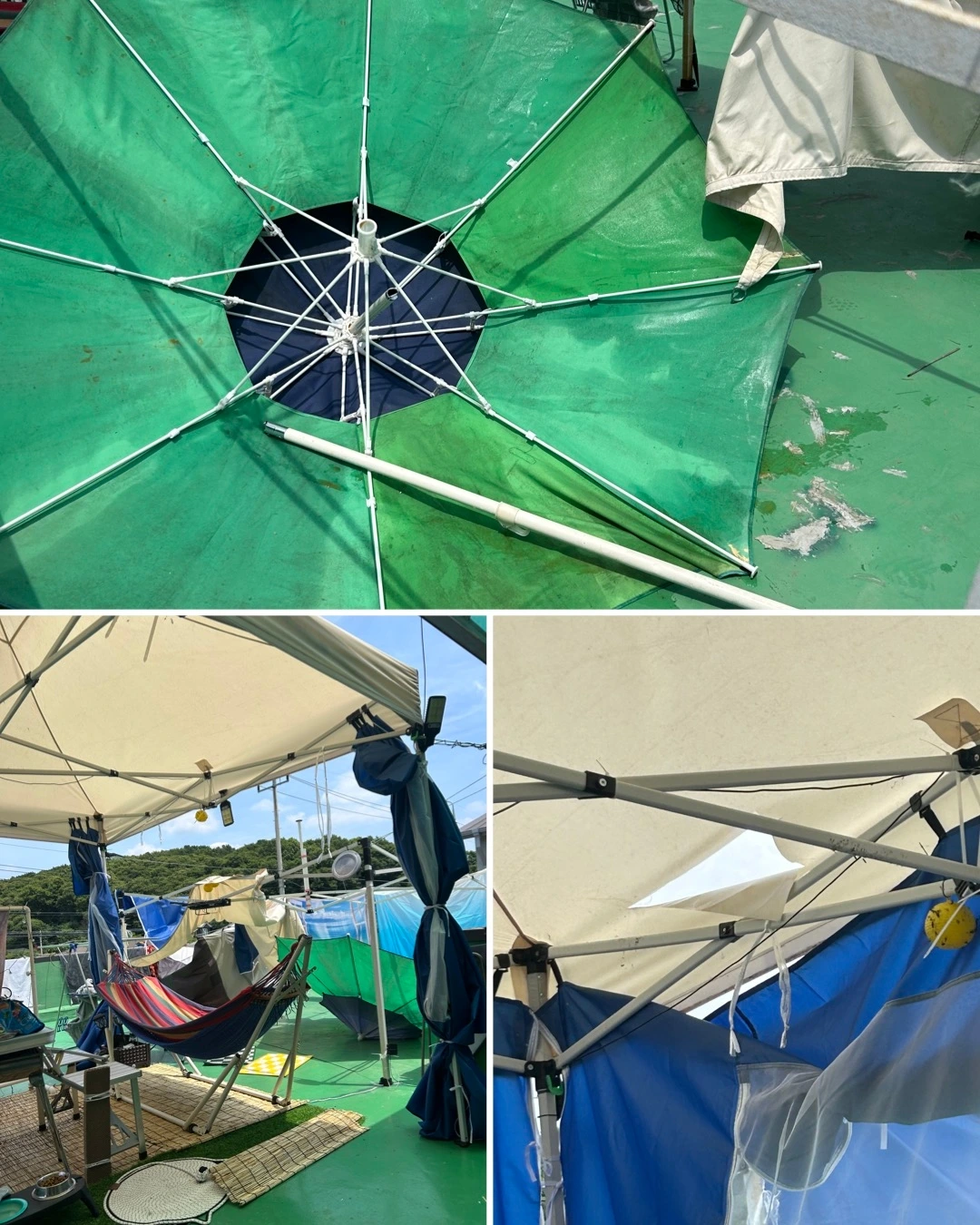 결국 몰아치는 비바람에 이번에도 역시 파라솔이 부러져 나간다. 천막 지붕이 날라가는 파라솔에 긁혀서 찢어졋다. 두대의 대형천막이 줄로 매어둠에도 심하게 자리이동을 하는지라 녀석들도 놀라고 나도 대처하느라 긴장해 셋다 한잠도 못잔채 아침을 맞는다.