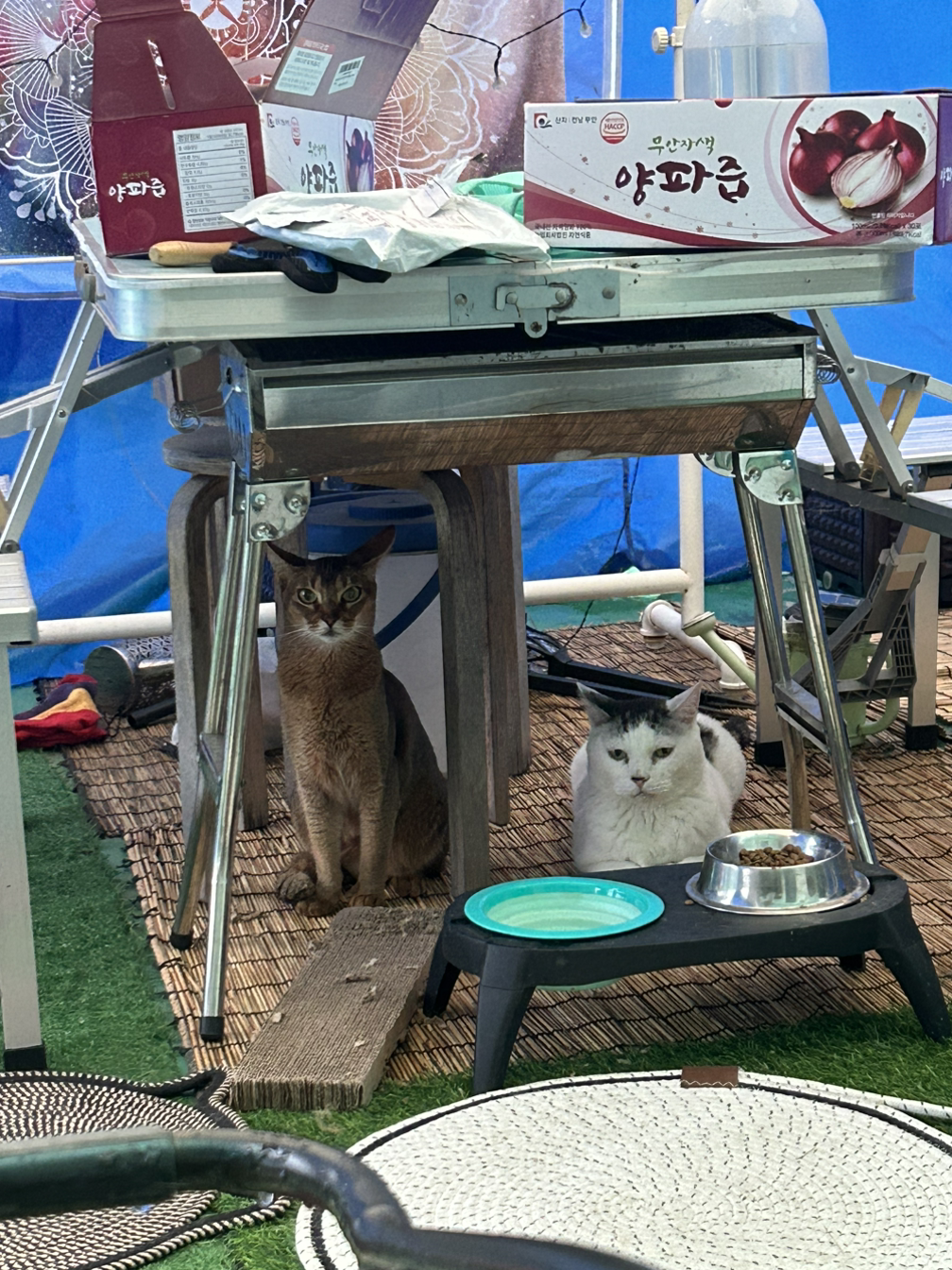 고양이들은 여름엔 비가 쏟아져도 실내보단 천막안을 선택한다. 텐트는 탐군의 아지트가 됐고 첼양은 천막동굴을 차지했다. 매일이 휴양지 놀러온 기분을 만끽하는 중인데 날씨가 추워짐 녀석들은 지금의 자유가 그리워질 것이다. 올해는 모험과 시행착오 실수의 연속 이었다지만 내년 여름은 아예 실외에 더위를 막을수 있는 거주 천막을 따로 하나 더 마련해 사람과 공간을 분리 해야 겠다는 생각을 한다. 그래야 나도 문명인 생활을 한다. 지금은 사람과 고양이들 간의 공간구분이 없어져 버리고 내가 (2:1 쪽수에 밀려) 고양이 패턴대로 (너저분 하게 그러나 자유롭게) 산다.