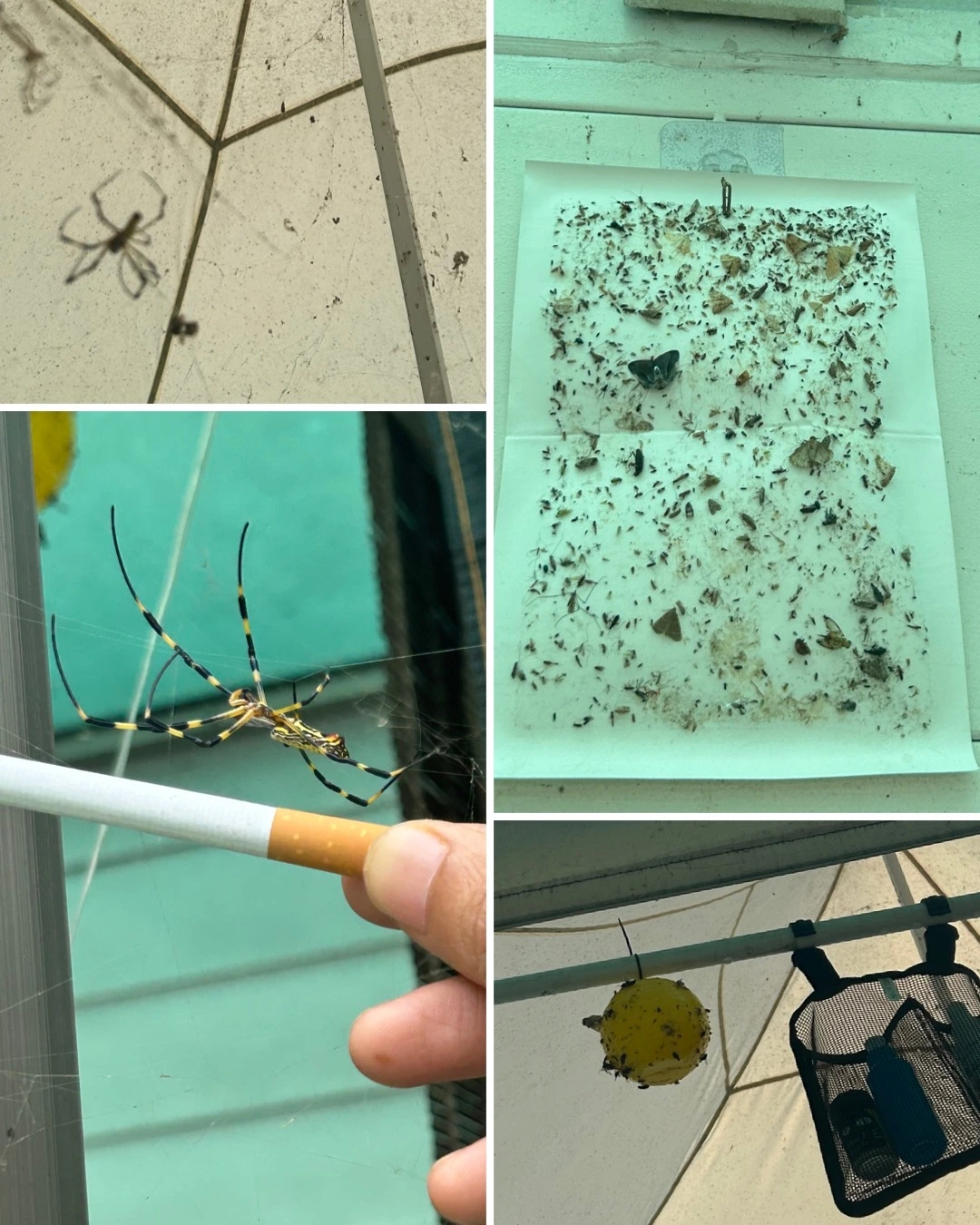 여름엔 채집기 모기향을 비롯, 거미와도 제휴를 맺고 수천마리 벌레들과 사투를 벌여야만 한다. 수많은 사마귀 잠자리 매미 나방등이 녀석둘의 장난감으로 매일같이 희생된다. 녀석들로선 온갖 사냥꺼리가 즐비한 지금이 천국일것이다. 곤충들의 왕 사마귀가 사람에겐 당랑권으로 맞서는데 고양이들에겐 도망 다니며 얻어맞다 결국 시체가 된다. 때론 손바닥 만한 풍뎅이도 날라들고 어디선가 손톱만한 개구리도 올라와 자진해 녀석들의 장난감이 된다.