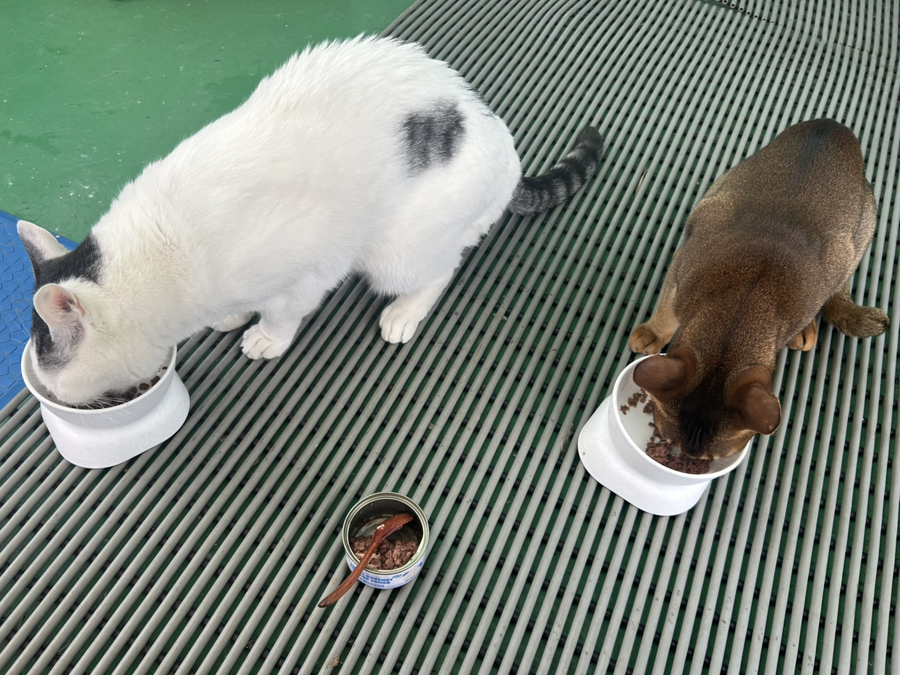 하루한번 캔을 딸때만 겸상이 이루어진다. 건식사료와는 달리 습식 사료는 사람의 손이간다. 사람이 관리하는 입장에선 편리함을 따라 캔은 시간 지남 땡이다. 첼양 식사 습관이 조금씩 나눠서 먹다놀다 하는건데 탐군이 첼양보다 두배는 식성이 강해서 자기것 다 먹고도 첼양이 남긴것 까지 다 훝어 먹는다. 첼양이 놀다와서 다시 먹으려 하면 밥그릇이 비어있다. 사람도 가끔 남이먹던 짜장 짬뽕 남긴거 갖다먹는 사람 있다. 찌개 한 냄비에 온 식구가 숟가락 들이대던 한식문화가 그렇다. 니반찬 내반찬 안 가린다.