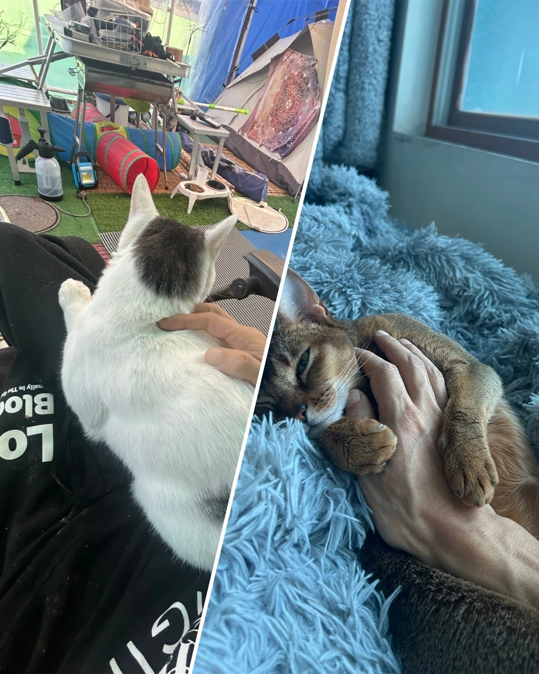 탐군은 여전히 아이처럼 양양대고 울고 조르는 타입이고 첼양은 무음에 조르지도 않고 도도하다. 탐군이 결국 뼈만남은 내 무릎 포갠것에 서커스처럼 안정적으로 앉는 기술을 연마해 낮 동안은 떨어지려 하지 않고 첼양은 내 침대위에 올라가 어서 오시와요 내가 잠자러 들어오기 만을 오매불망 기다린다.