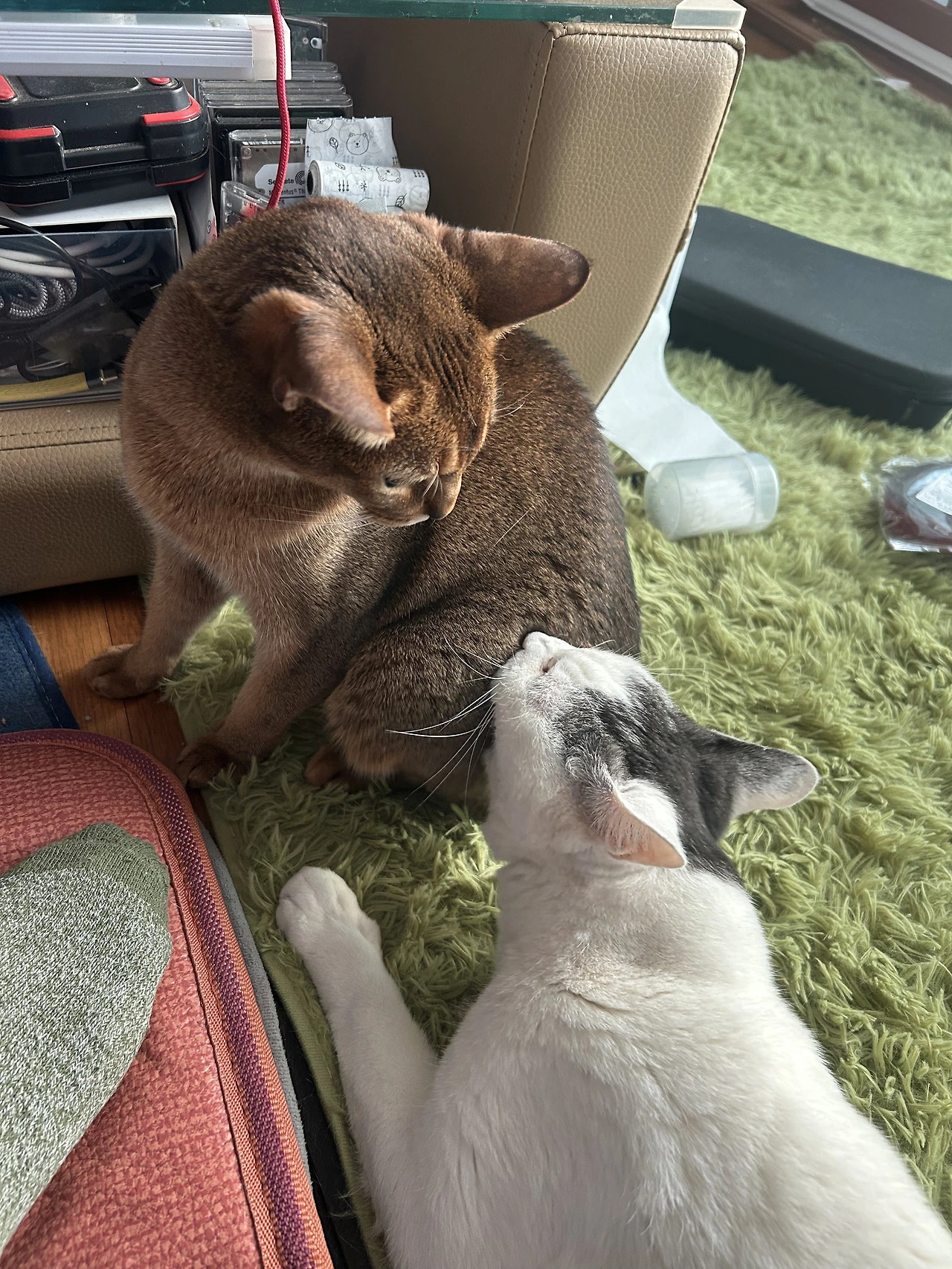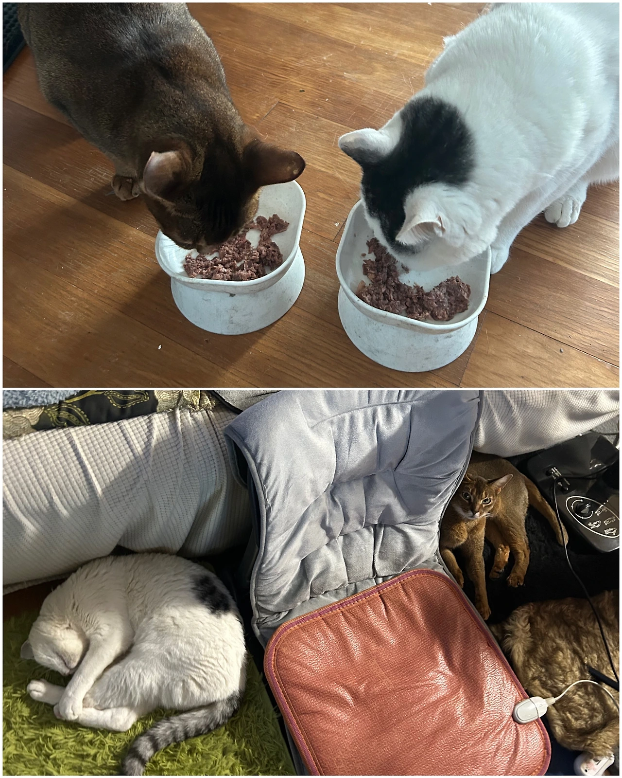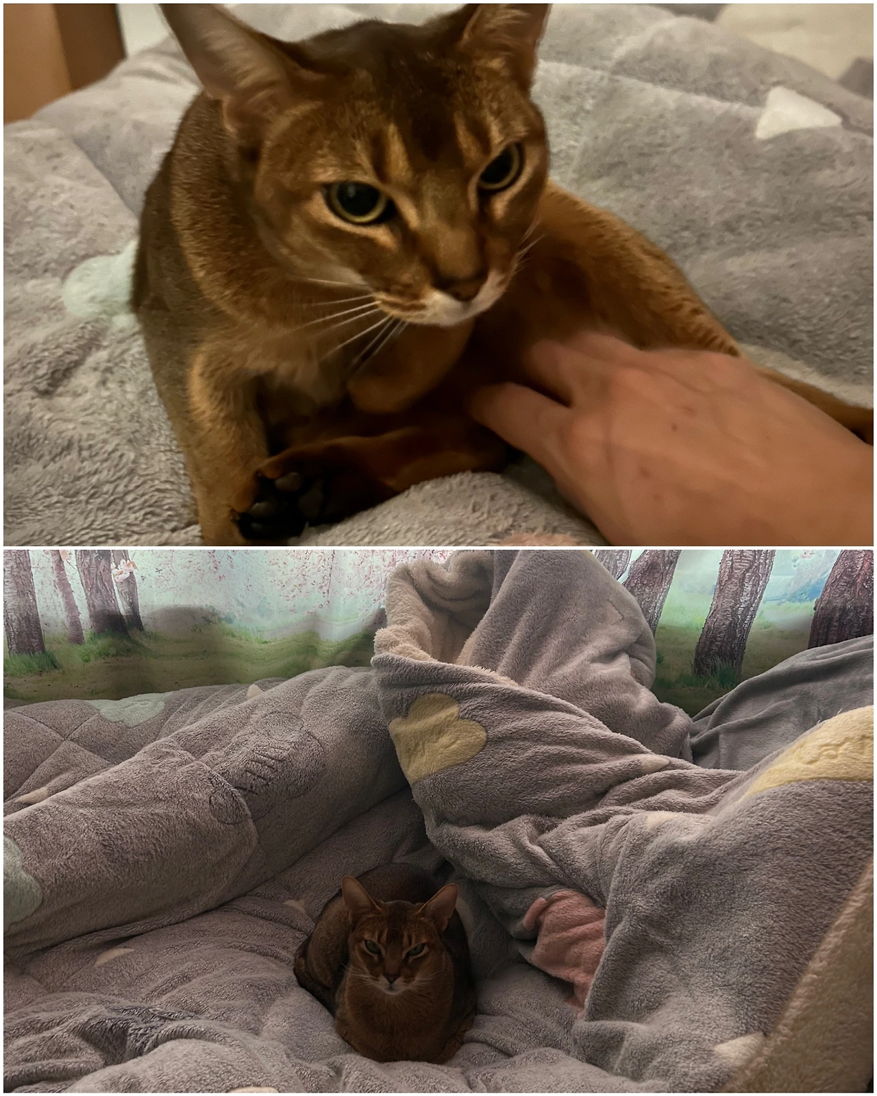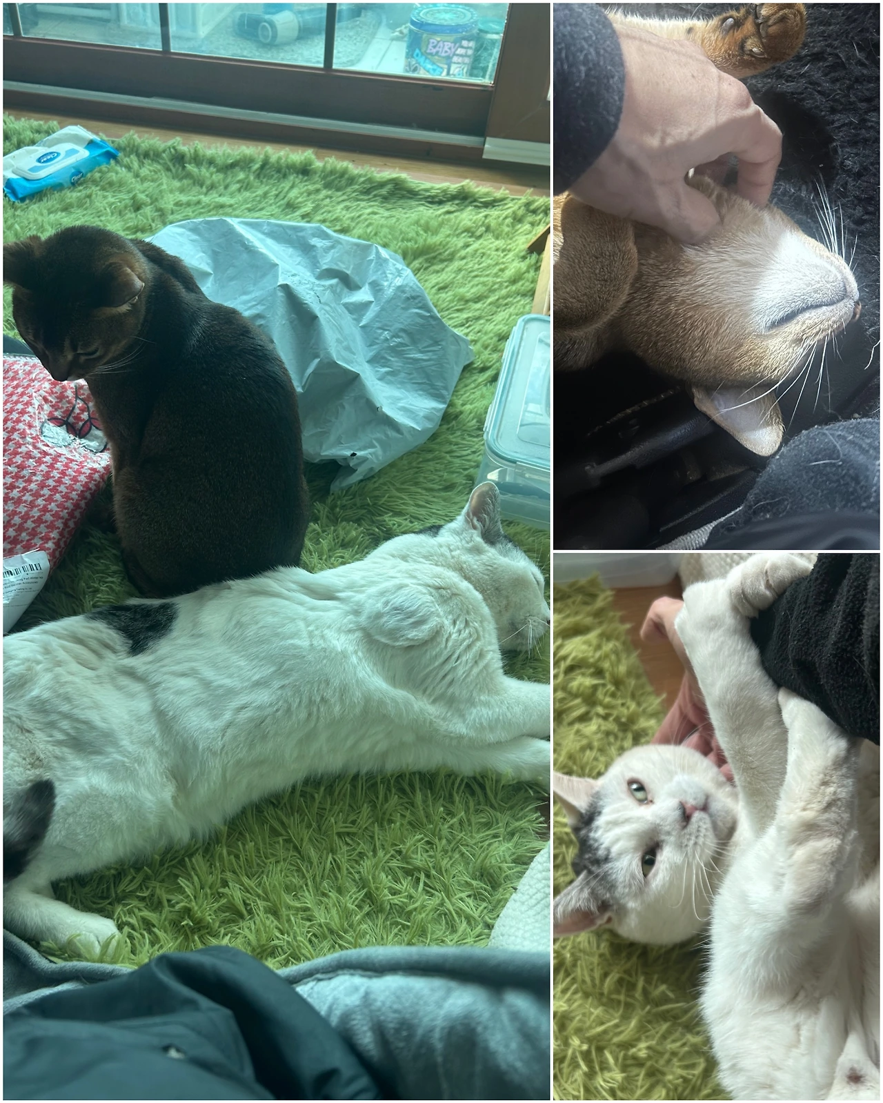 실강이 하다 기력이 딸려 결국 사람인 내가 위생을 당장은 포기하게 됐다. 그러다보니 그냥 사람도 고양이처럼 같이 뒹굴게 된거다. (녀석들도 목욕탕을 시간 날때마다 계속 탐방하는것이 어 ? 왜 안씻기지? 하는듯 하다.) 털 범벅에 마당 나갔던 발로 이불속 밟고 다니고 할퀴는대로 상처가 나기도 한다. (그나마 흙바닥이 아닌게 다행이다.)