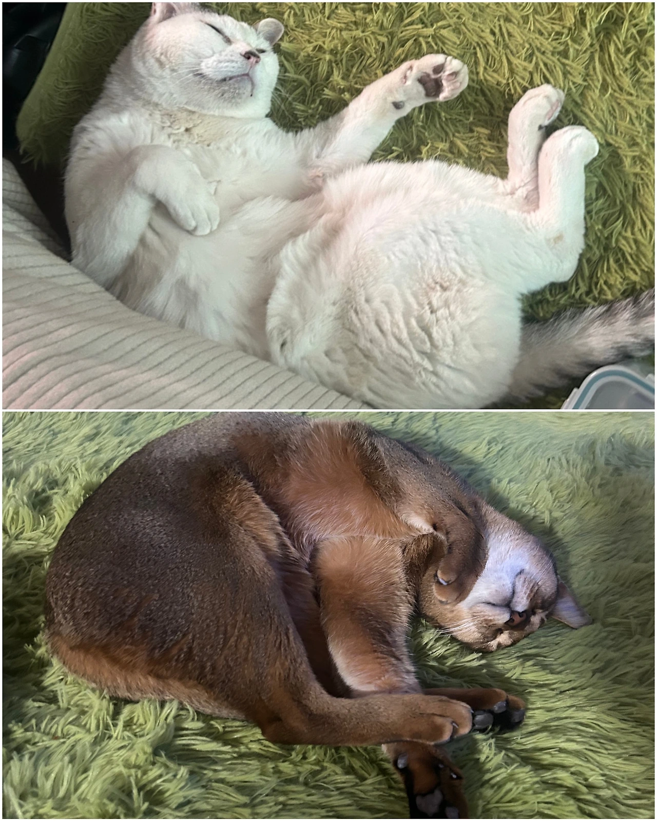 사람도 교육에 의해 예절을 배우듯 고양이들을 교육 시키려면 사람또한 그만한 부지런함이 따라야 한다. 귀찮다고 그냥 방관하면 (사람 판단에) 나쁜버릇들이 생긴다. 침대에 눞기만 하면 올라타고 꾹꾹이 할때마다 목욕 안 시킨걸 후회하면서도 그냥 넘어가니 이젠 아침마다 아예 얼굴까지 짓이기면서 일어나 일어나 꼬리와 엉덩이를 비벼댄다. 잠결에 시원한 꾹꾹이 전신 안마를 받으며 기상하게 된다. 그르렁 침흘리며 털로 부벼대면 잠결에 귀찮아 하면서도 스킨쉽이 나쁘진 않은데 안 씻긴게 영 찝집하다.