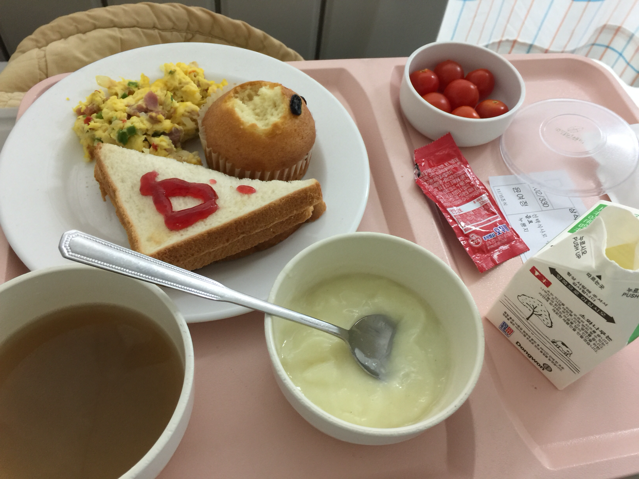 이제 병원 돌아가는 시스템을 왼만큼 터득한지라 식사는 선택지가 오기전까지 뭐가 나올지 모르지만 무조건 선택식으로 주문해 두니 첫날 저녁은 깜풍기가 나오고 아침은 토스트에 머핀 에그오물렛이 나온다.. 그나마 선택식은 거의 다 먹게되는 경우가 많고 일반 환자식은 맛이없어 절반먹기도 힘이드는데 그래도 암센터 환자식은 다른 병원에 비하면 무척 괜찮게 나오는 편이다..