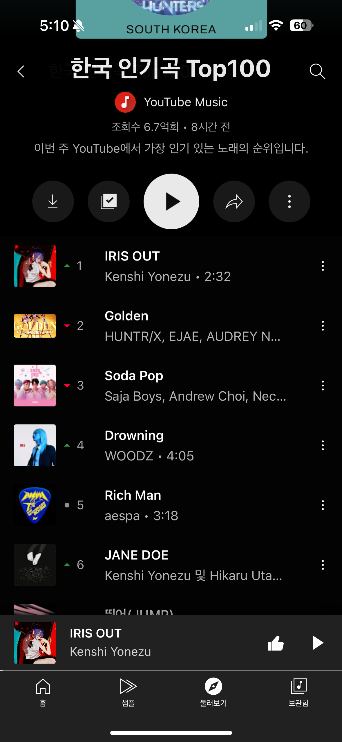 ‘IRIS OUT’이 일본에서 스트리밍 관련 모든 기록을 갈아치우는 것은 놀랍지만 있을 법한 일이다. 하지만 이 곡이 유튜브 뮤직 주간 차트 1위를 차지하고 멜론 일간 차트에 랭크인하는 모습이나, 빌보드 글로벌 200 차트 5위를 차지하는 모습은 놀라움을 넘어 괴이할 정도다. <체인소 맨>이 서구권 인기가 꽤 크다고는 알고 있었지만, 극장판이 아직 북미 개봉도 안 했는데 주제가가 케이팝 중에서도 글로벌 실적으로 손꼽히는 곡들과 비슷한 흥행 추이를 보이고 있으니, 이 곡과 영화가 어디까지 뻗어가며 어떤 파급효과를 가지고 올 지 이젠 내 머리로 도저히 계산이 서지 않는다. 이게 정말 현실일까?