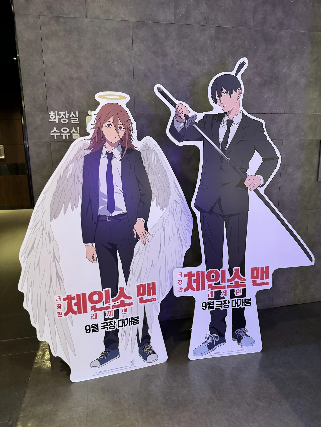 <극장판 체인소 맨 : 레제 편>의 개봉일을 앞두고 내가 속으로 기뻐했던 것은 <극장판 귀멸의 칼날 : 무한성편>의 대흥행이었다. <귀멸의 칼날>이 500만 관객을 돌파하고 회사 상사들 사이에서도 화두에 오르는 분위기가 조성되니, 비슷하게 액션이 강조된 극장판 애니메이션인 <체인소 맨>도 낙수효과를 누릴 수 있을 것 같아서였다. 영화의 대규모 개봉은 <귀멸의 칼날>의 영향력 덕분에 그나마 납득 가능했는데, 이번 <극장판 귀멸의 칼날 : 무한성편>을 아득히 넘어서는 <극장판 체인소 맨 : 레제 편> 주제가의 흥행 실적은 나도 설명할 방법을 모르겠다.