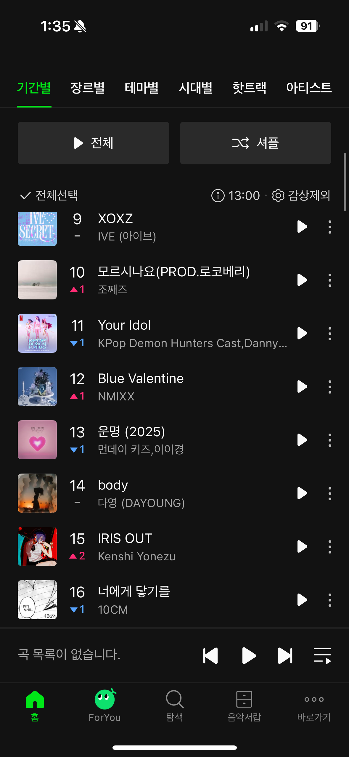 그런데 비역세권 지역으로 독립하면서 내 출근시간은 케이팝 앨범과 멀어졌다. 지하철과 멀어지면서 가려야 할 소음이 줄어들다 보니, 에어팟 볼륨을 한두 칸씩 줄이고 맥시멀한 소리를 조금 덜 찾게 되었다. 통근 시간이 짧아지니 흐름 유지가 필요한 앨범보다는 곡 단위 청취를 더 많이 하게 되기도 했다. 요새는 주로 듣고 싶은 아티스트를 애플뮤직에 검색하고 인기 곡 리스트에서 마음에 드는 곡을 골라 들으며 통근 시간을 채우곤 한다.