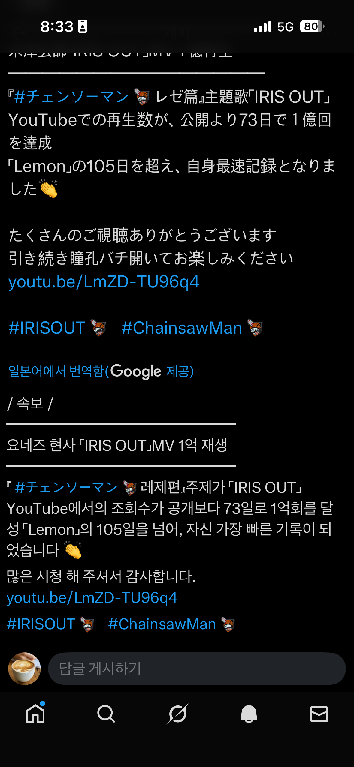 숏폼 시대를 맞아 라이트 팬을 진성 팬으로 만들던 번역 컨텐츠에 신규 팬을 유입시키는 역할이 더해졌다. 라이브나 뮤직비디오 클립에 가사 번역을 더한 쇼츠는 해외 아티스트를 소개하는 일반적인 경로로 자리잡았고, 음악과 인터뷰 번역을 매치한 영상을 통해 아티스트의 커리어와 캐릭터를 소개하는 영상도 숏폼의 확산과 함께 기하급수적으로 늘었다. 내게 이 사실을 크게 알려준 사건은 <체인소 맨 : 레제 편>의 흥행이었다. 영화의 화제성 상당 부분을 주제가의 대흥행이 담당하다 보니 주제가 두 곡을 만들고 부른 요네즈 켄시에 대한 숏폼 콘텐츠가 영화의 화제성에 비례하여 퍼져 나갔다. 딱히 일본 음악이나 일본 콘텐츠에 큰 관심이 있을 것 같지 않던 친구가 인스타그램 DM으로 내게 요네즈 켄시나 체인소맨에 대한 한국어 릴스를 보내주는 것을 보며, 앞으로 이 사람 공연 가기 더 힘들어지겠구나 싶었다.