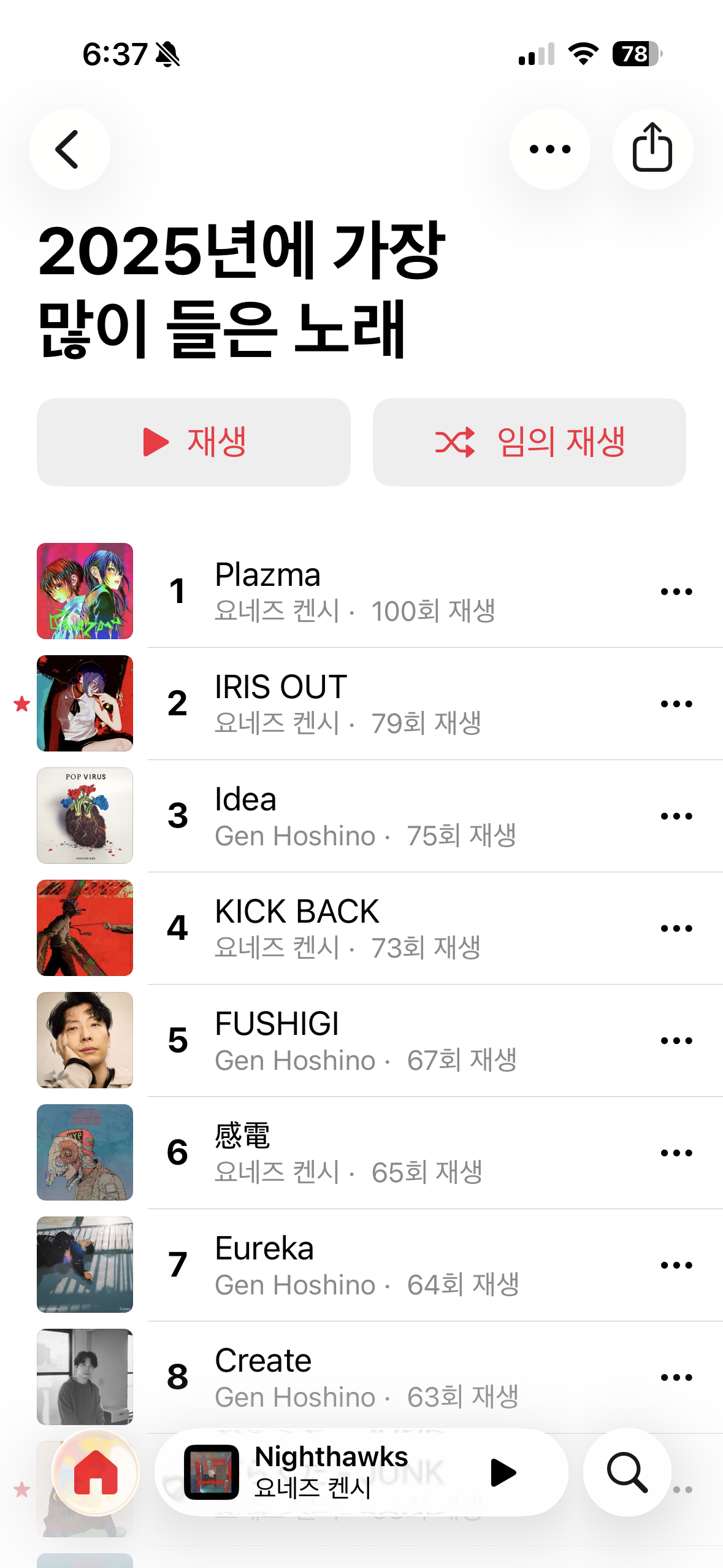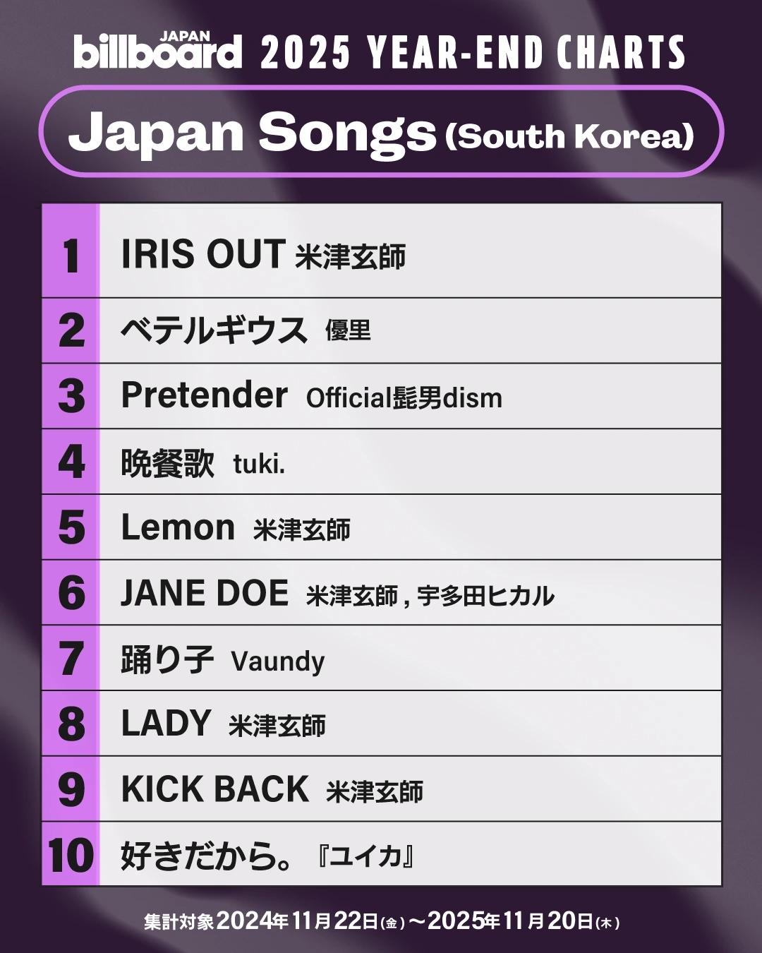 참고로 요네즈 켄시의 인디 시절 발매작인 “diorama”나 “OFFICIAL ORANGE” 등 보컬로이드 작업물은 멜론, 지니 등 국내 음원 사이트에는 없고, 유튜브 뮤직이나 스포티파이 같은 해외 사이트에만 공개되어 있다. 그래서 국내 요네즈 켄시 팬들은 대체로 해외 음원 플랫폼을 사용한다. 연말에 제이팝 팬들이 해외 음원 플랫폼의 Recap 결과물을 줄줄이 올리는 모습을 볼 때면, 한국 내에서 유튜브 뮤직을 필두로 해외 음원 플랫폼의 점유율이 높아진 것과 한국에서의 제이팝 청자 증가도 관계가 있지 않을까 추측해보게 된다. 차트보다 알고리즘의 의존도가 높은 해외 플랫폼의 사용자 수가 늘어나면서, 차트 밖에서 자신의 분야를 혼자 파고들고 취향 단위의 군집을 형성하는 청자들이 과거보다 가시화된 것 아닐까? 멜론 Top 100에 진입한 제이팝이 역대 다섯 곡이 안 될 정도로 제이팝이 국내 차트와 거리가 멀었다는 것을 생각해보면 말이다.