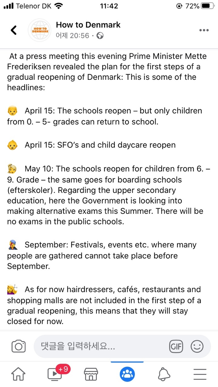 요약하자면 유치원 및 보육원의 학교 수업이 재개되는 것 외에는 5월 10일까지 현 상태가 유지된다는 점. 단, 사회적 거리두기 등을 잘 실천해 안정화되면 부활절 연휴(4/13) 이후 점차 개방할 수 있다는 점을 덧붙였다고 한다. 주덴마크 대사관에서 받는 소식, 덴마크어로 된 기사를 영어로 번역한 것 그리고 한국 기사를 종합해 정보를 파악하고 있지만 실제 현지인들은 어떻게 생각하고 있는지 등 체감할 수 있는 정보를 파악하는 데 한계가 있다 보니 일상생활이 가능할 때까지 그저 계속 조심하려고 한다.