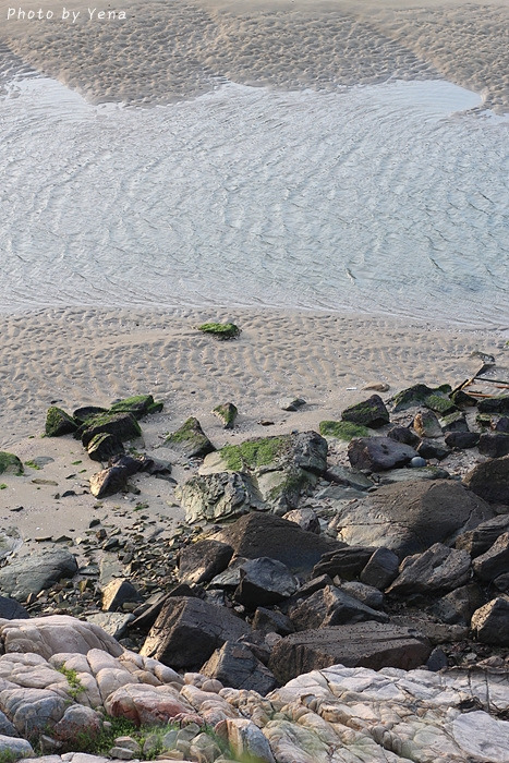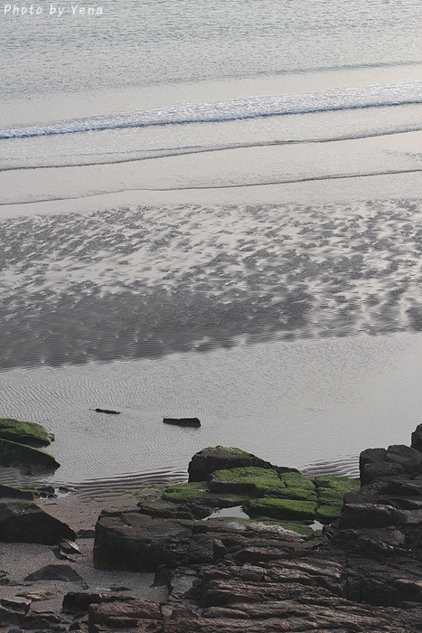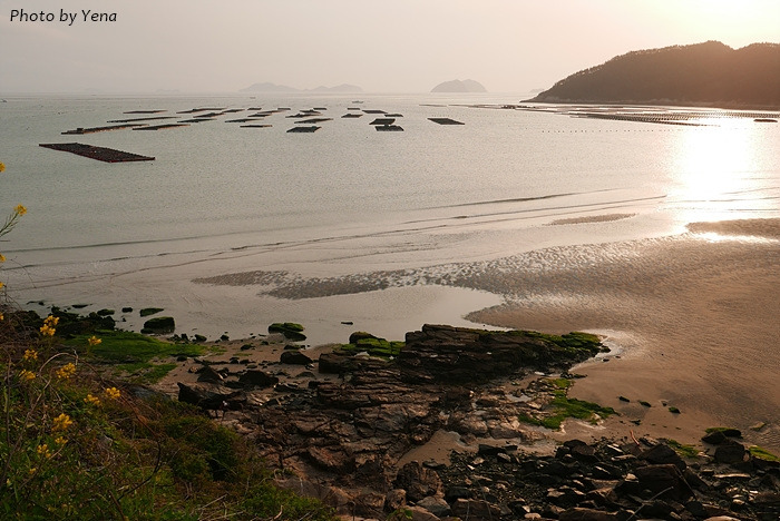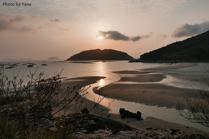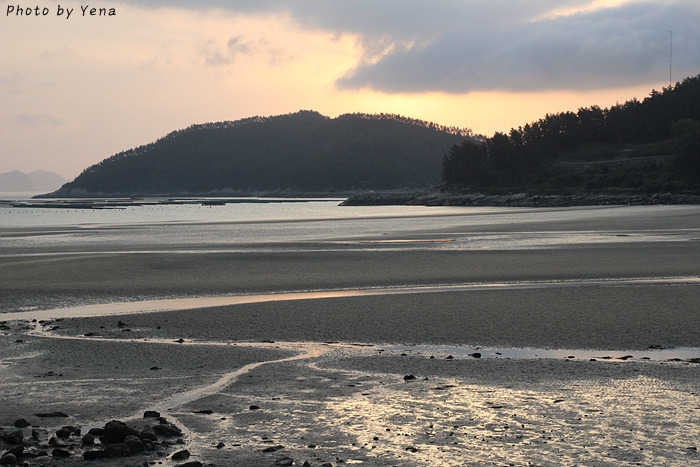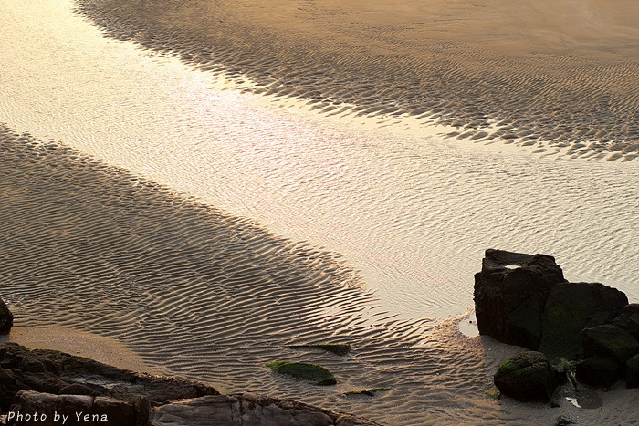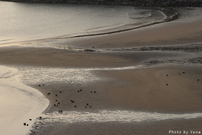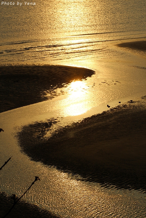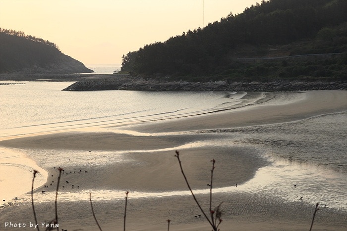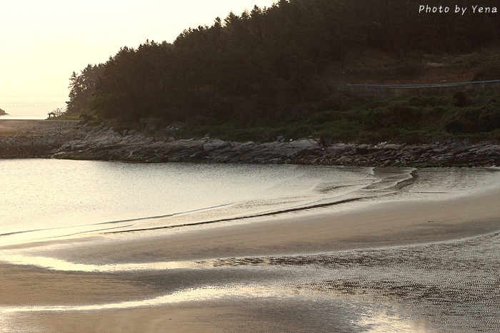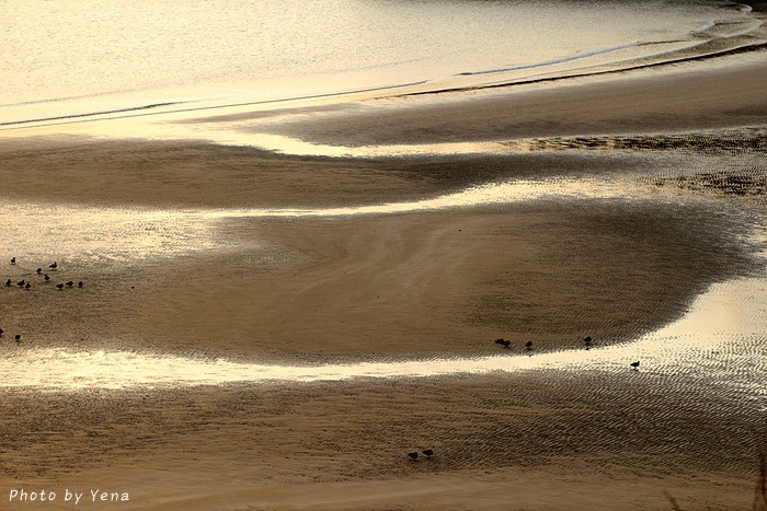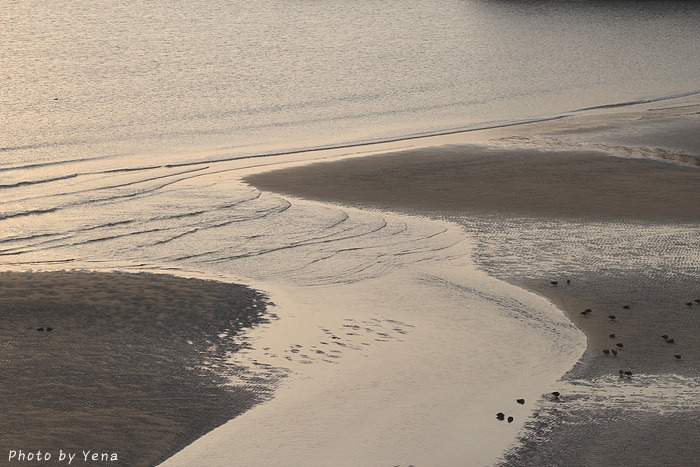 썰물 때의 갯벌 풍경이었는데, 갯골(?)을 따라 찰랑거리며 황금빛을 받아 흐르는 바닷물과 모래갯벌의 풍경이 아름다웠다. 서해안의 갯벌과는 또 다른 느낌....