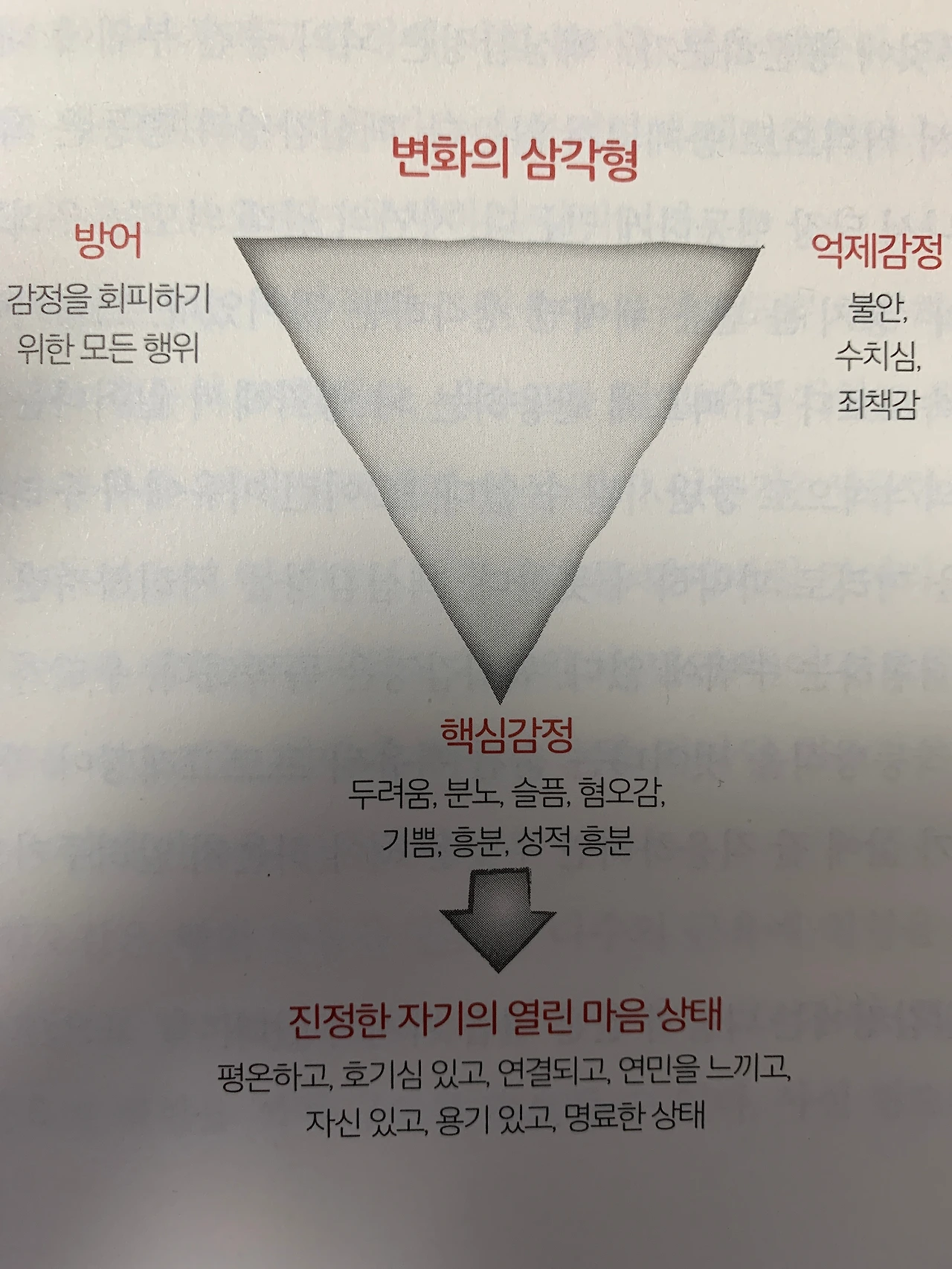 사람은 누구나 '변화의 삼각형' 안에서 감정이 움직이고, 역삼각형 모양의 변화의 삼각형에서 아래 꼭짓점에 해당하는 핵심감정으로의 전환이 중요하고 그러면 자신의 마음이 열리면서 평온해진다는 주장입니다.