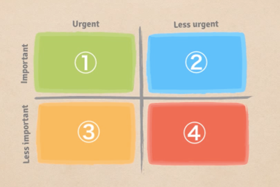 <1번영역: 중요하고 급한 일 2번영역 중요하지만 급하지 않은 일, 3번영역 중요하지 않지만 급한 일, 4번영역 중요하지도, 급하지도 않은 일을 구분한다.>