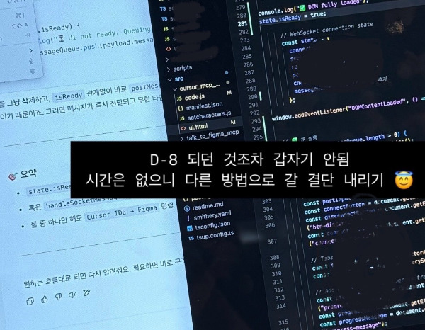 한 시간이 어떻게 지나갔는지 모르겠다. 결과는 어제와 똑같았다. 로그라도 몇 번 더 찍었으니 똑같다고는 할 수 없을까. 그러나 Figma는 여전히 아무런 반응을 보여주지 않았다. 버튼을 누를 때마다 조금씩 더 깊은 허탈함이 쌓였다. 똑같은 명령어를 복사하고 붙여넣고, 같은 화면을 바라보고, 같은 오류를 고쳐보려 애썼지만, 시간은 빠르게 지나가버렸다. 단 한 발자국도 나아가지 못한 것 같은 느낌이었다.