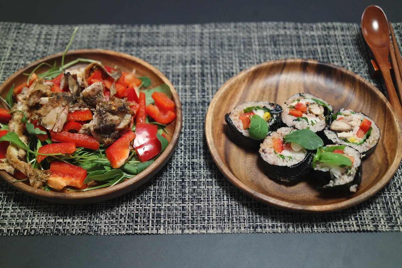 김밥을 한 입 먹을 때 느껴지는 재료들의 다양한 식감이 참 만족스럽다. 기존의 단무지와 햄 대신 넣은 루꼴라와 파프리카, 그리고 버터치킨은 초록과 빨강 그리고 주황의 색의 조화를 이루며 입맛을 다시게 한다. 샐러드의 경우 루꼴라의 초록색과 파프리카의 빨간색 그리고 버터치킨 색의 조화가 아름답기만 하다. 김밥이 터졌는데도 이렇게 아름답기만 한 것을 보라!