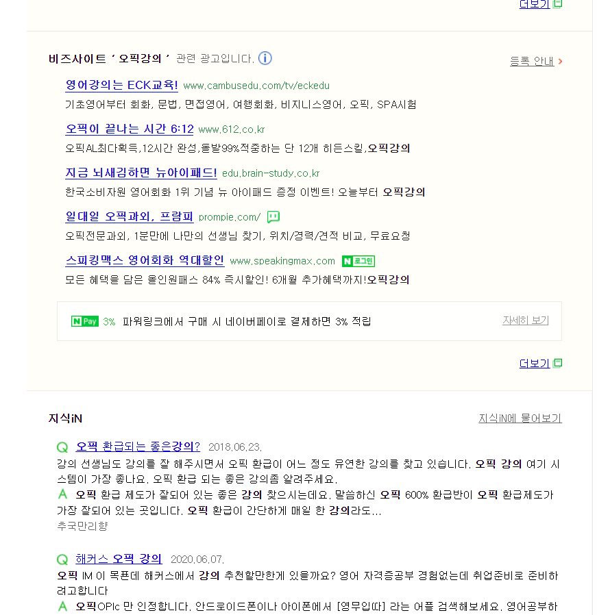일례로, 유사한 키워드 같이 보여도 완전 다른 검색 결과가 나오기도 한다. 네이버 PC 버전에서 '오픽 강의'를 검색하면 최상단부터 중간까지는 파워링크로 오픽 교육을 진행하는 학원 광고가 뜨고, 그 다음에 오가닉으로 뜨는 탭이 지식IN이다. 반면, 네이버 PC 버전에서 '오픽 인강'을 검색하면, 학원 광고 다음으로 포스트 탭이 노출된다.