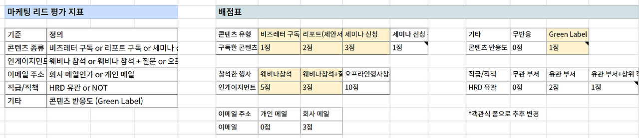 배점표나 점수 기준은 추후 업데이트가 되어야 하는 것 같습니다. 마케팅 파이프라인도 계속 늘어날 테니까요.
