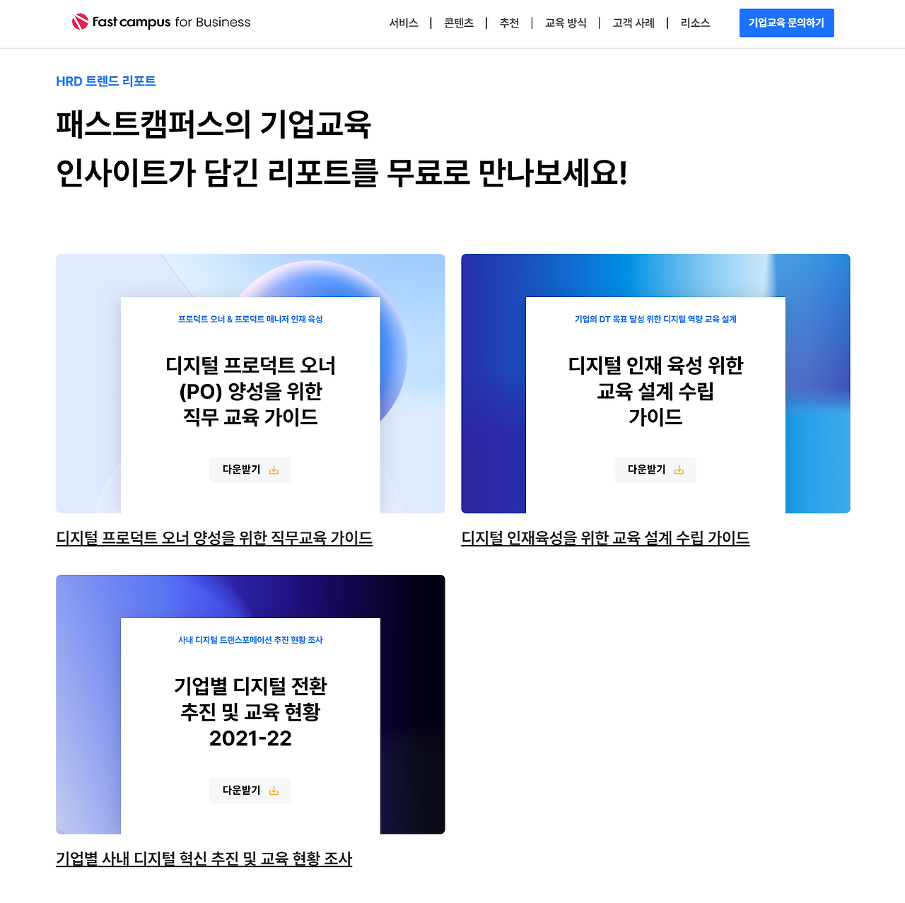 그래서 잠재고객이 좀 더 가볍게 저희 교육 서비스에 접근할 수 있는 장치를 설치하기로 했습니다. 온라인 컨퍼런스를 통해 도입 문의보다 가벼운 수준의 고객 DB를 수집할 수 있게 되었고요. 디지털 전환과 관련해 외부에서 진행한 설문조사를 리포트로 만들어 배포하기 시작했습니다. 뉴스레터 외 MQL(Marketing Qualified Leads)이라는 걸 처음 쌓아보았어요.