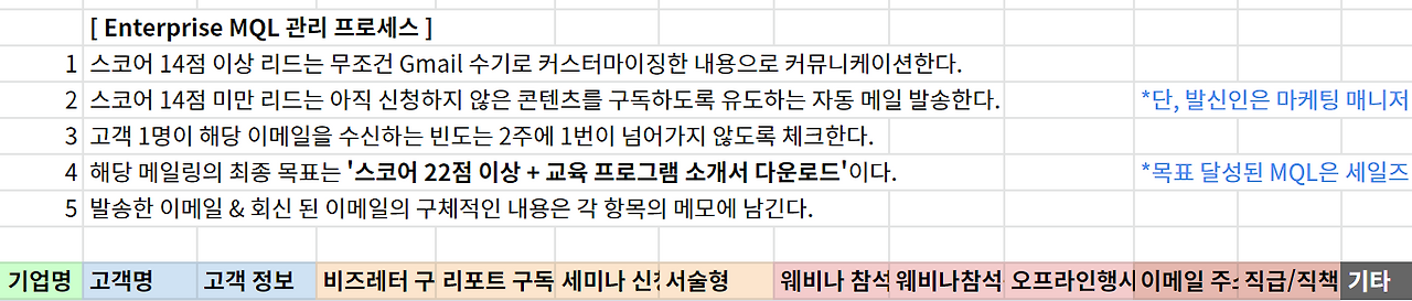 그리고 일정 점수 이상을 얻은 MQL만 따로 모아 CRM 마케팅을 추가적으로 진행하고 있습니다. 조금만 더 관리하면 도입 문의를 남길 가능성이 높다고 생각되는 고객군을 대상으로 커뮤니케이션을 더 시도하는 건데요. 사실 이런 마케팅 리드에 대해서는 자동화 메일 캠페인보다는 수기 메일 발송을 통해 커뮤니케이션하고 있습니다. 특히, 해당 리드의 기업이 어디인지 좀 더 주시하며 고객이 관심 있어할 만한 교육 프로그램 제안서나 프로모션 참여 제안 메일을 보내보기도 하고요.